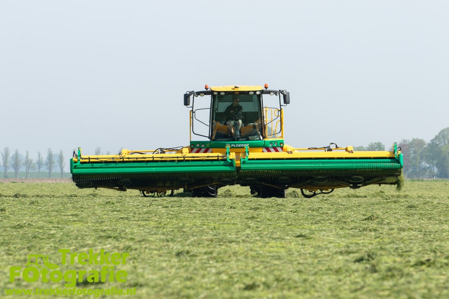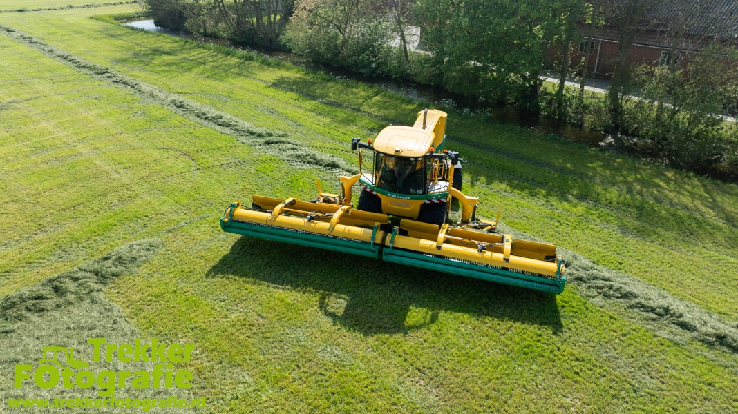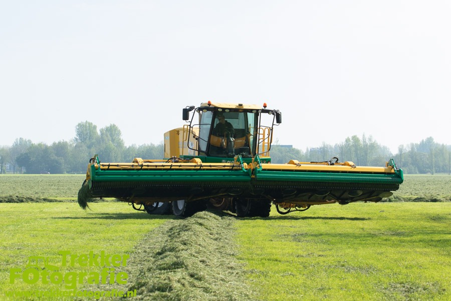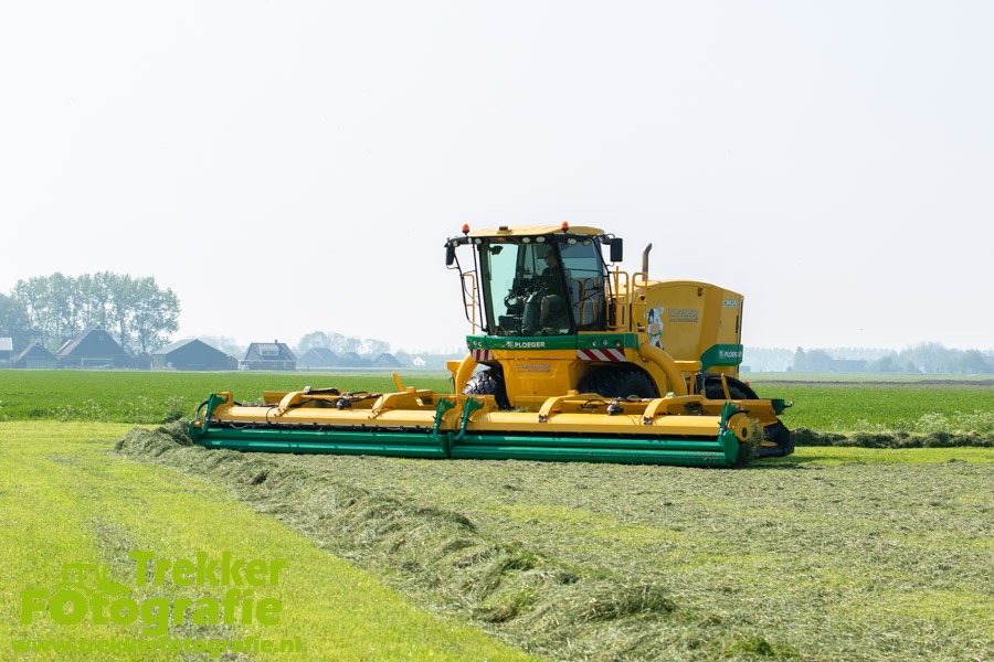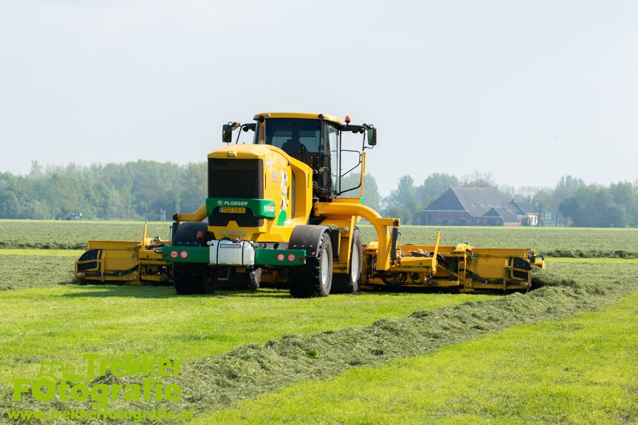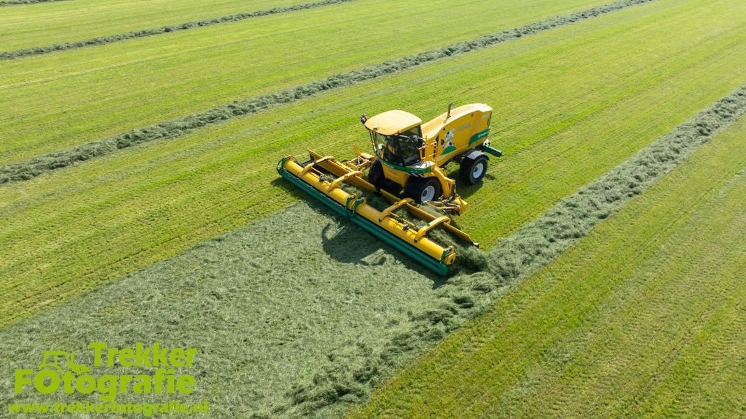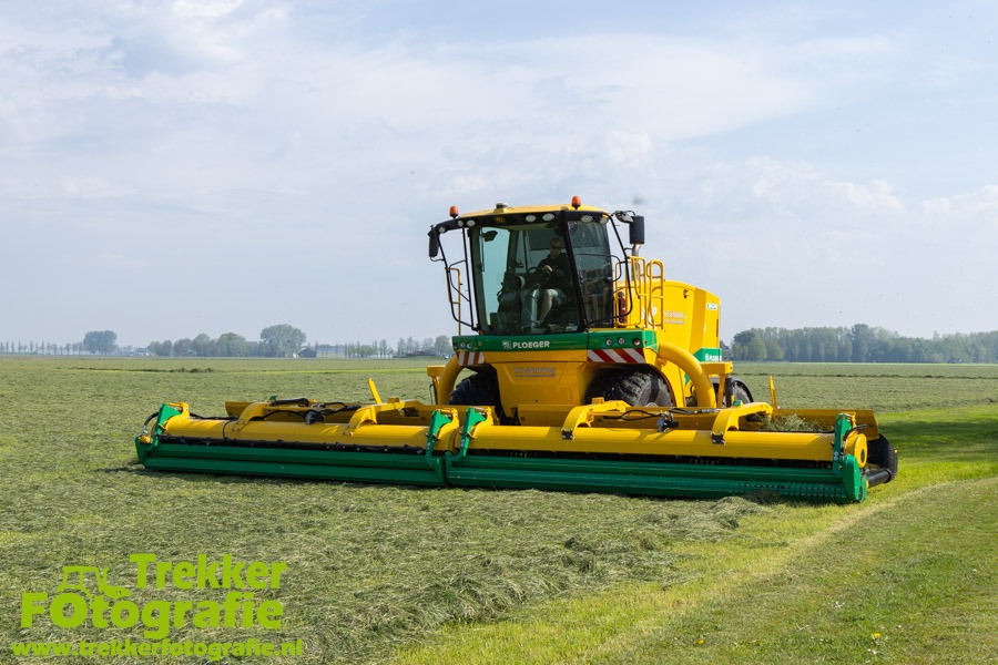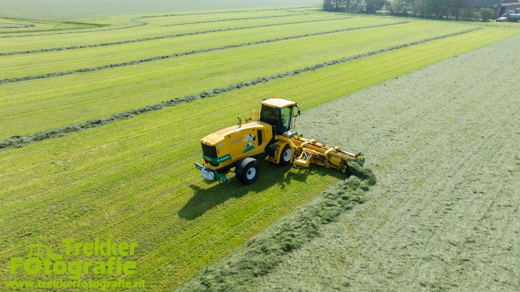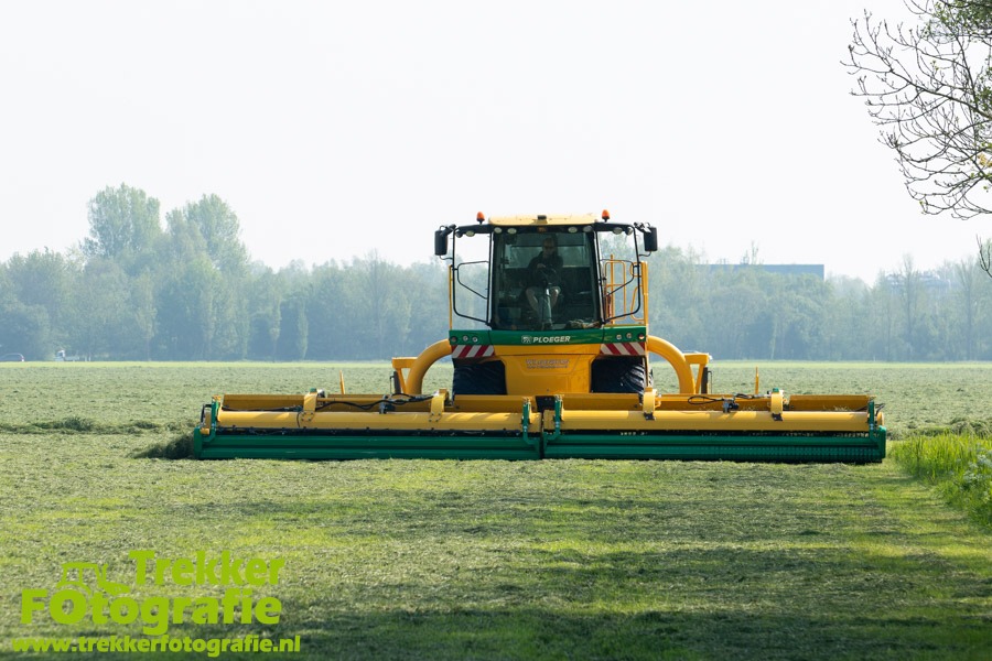 Het gras werd geharkt op een zwad van 22 meter gras bij elkaar met hun Ploeger CM4240 zelfrijdende bandhark.
