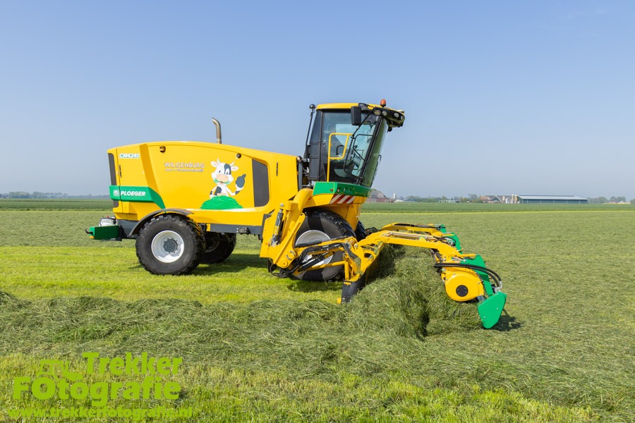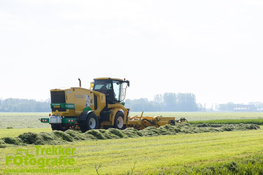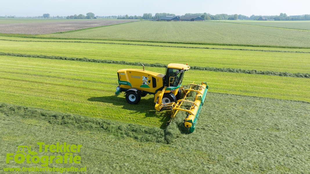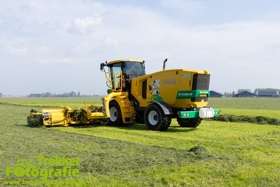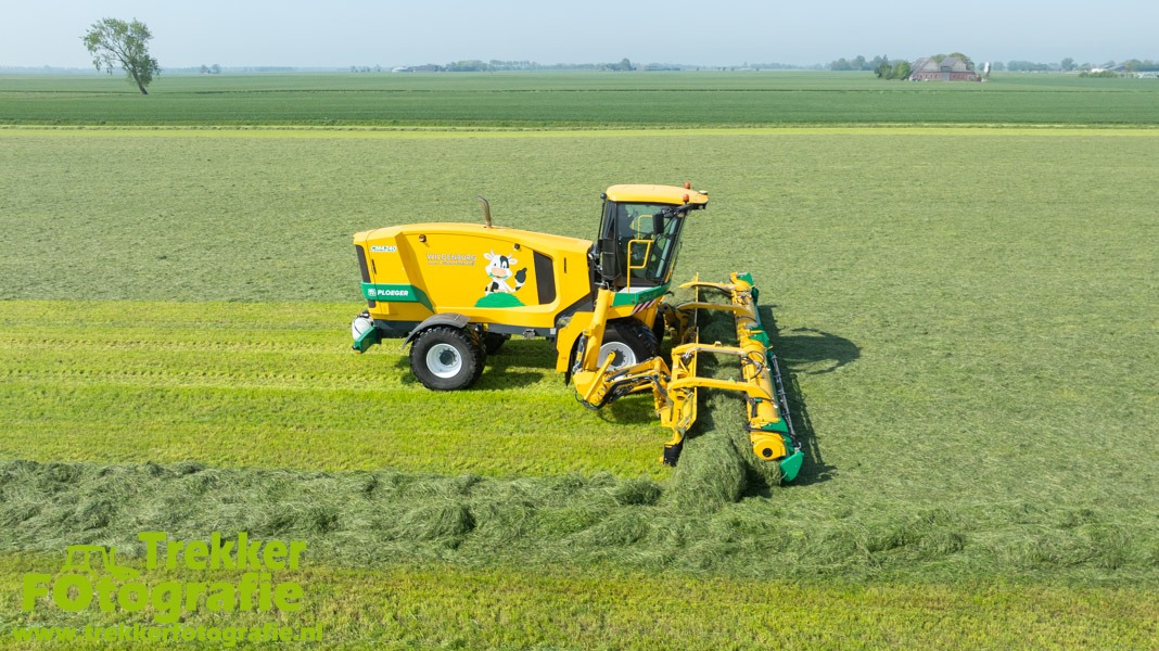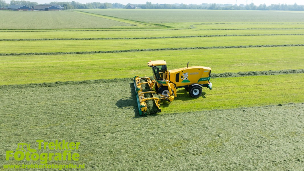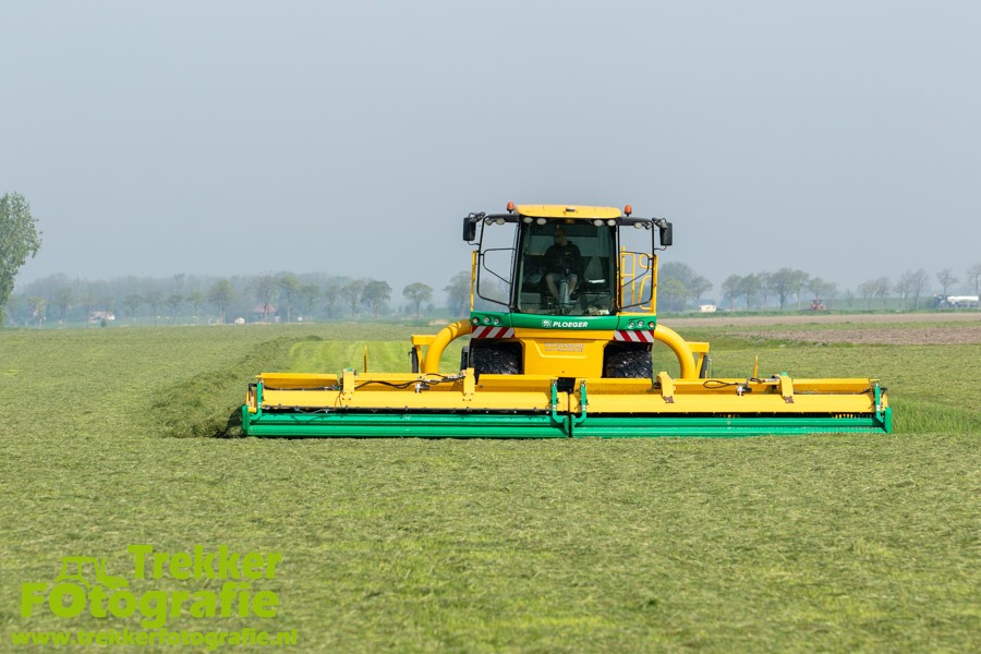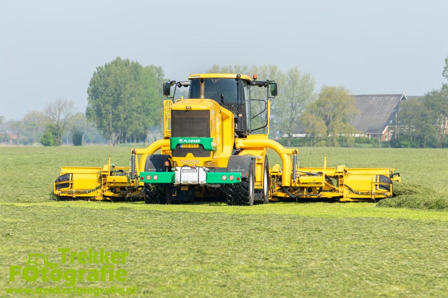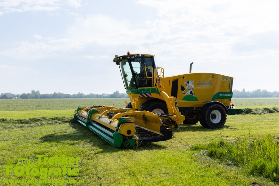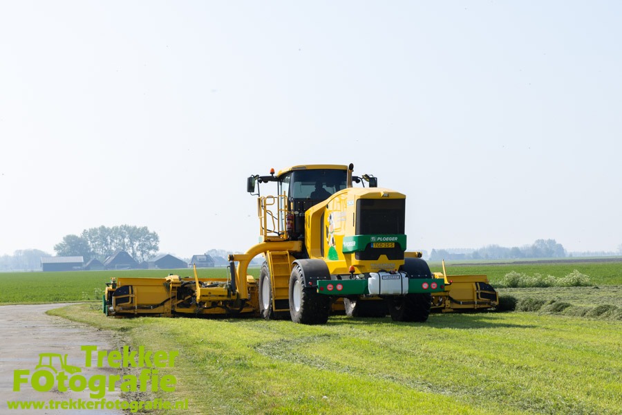 Het gras werd geharkt op een zwad van 22 meter gras bij elkaar met hun Ploeger CM4240 zelfrijdende bandhark.