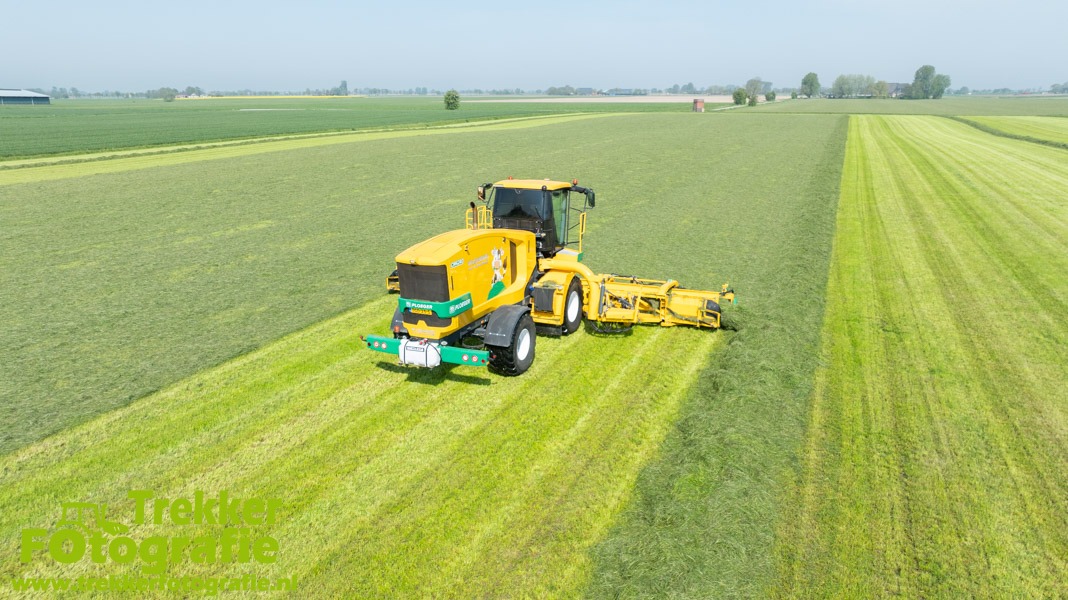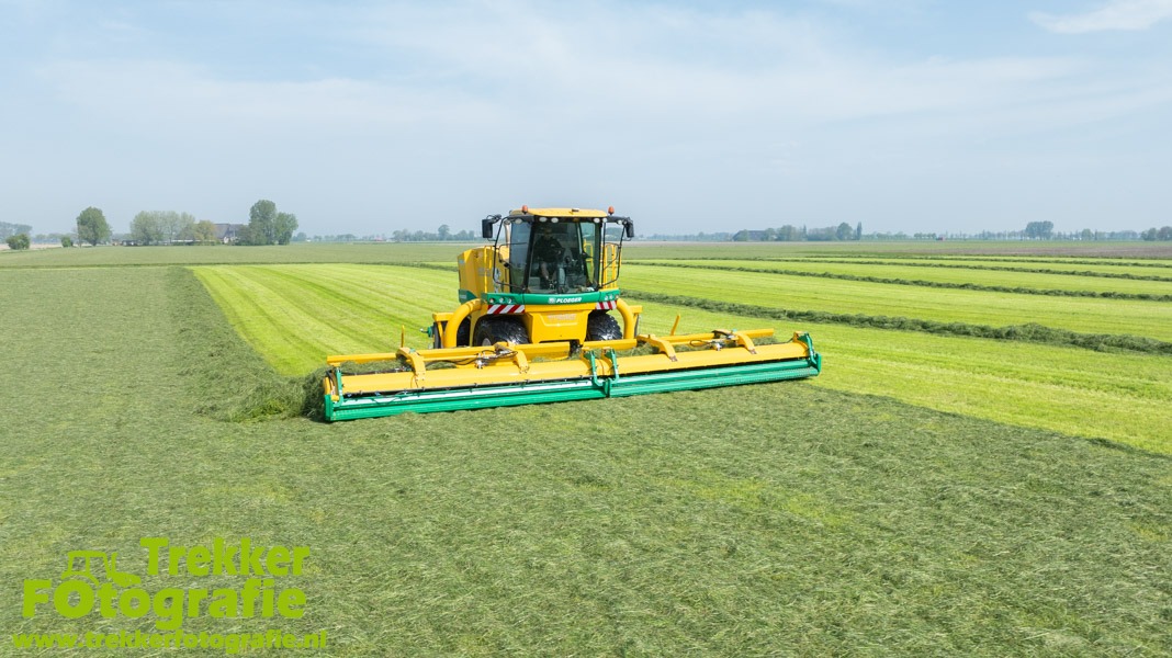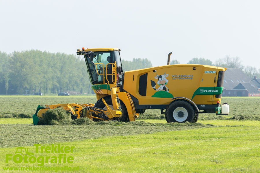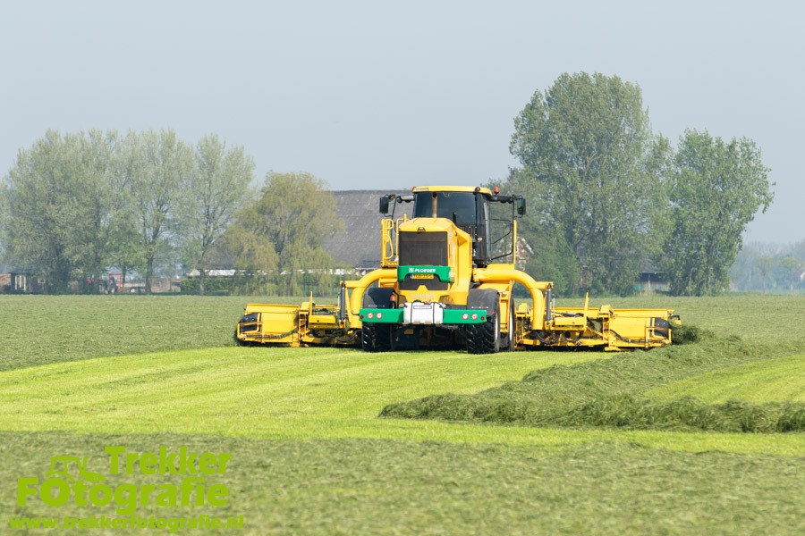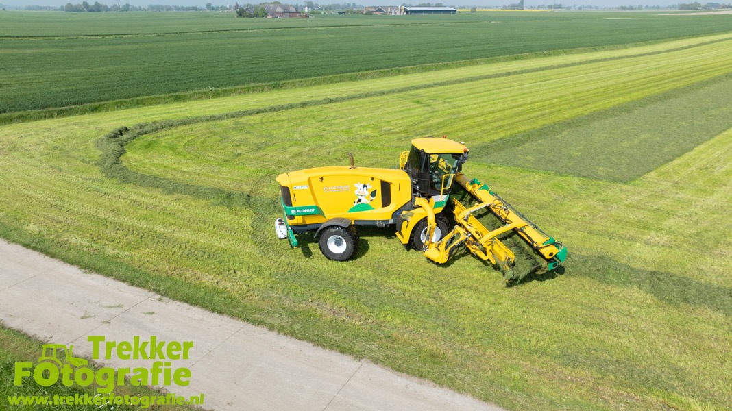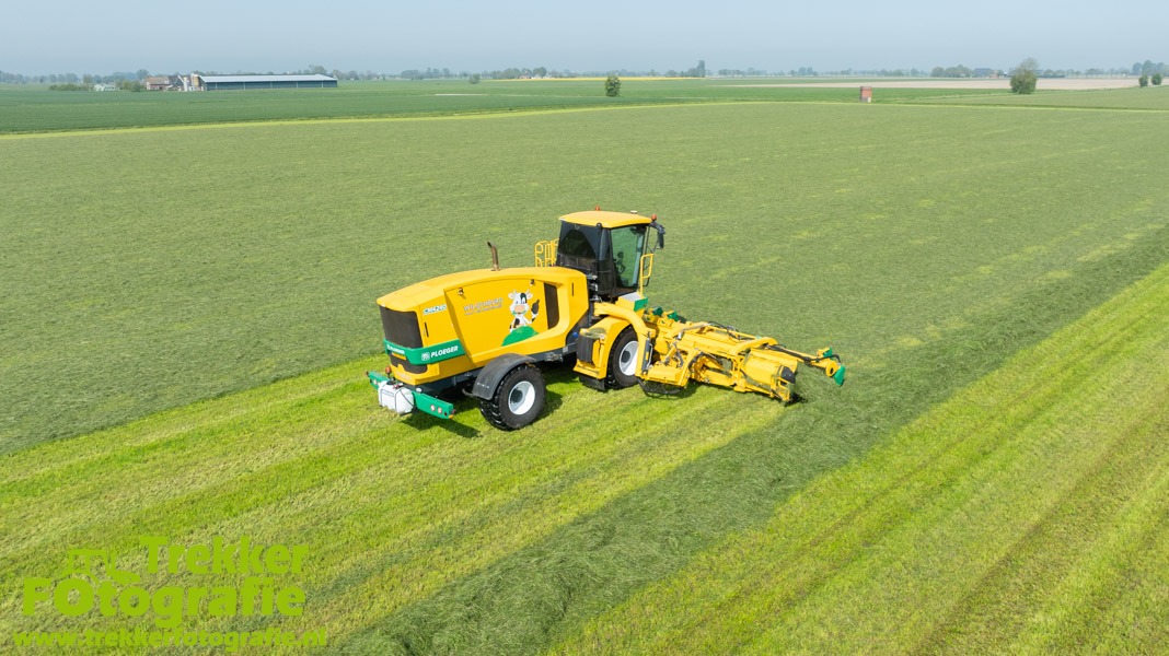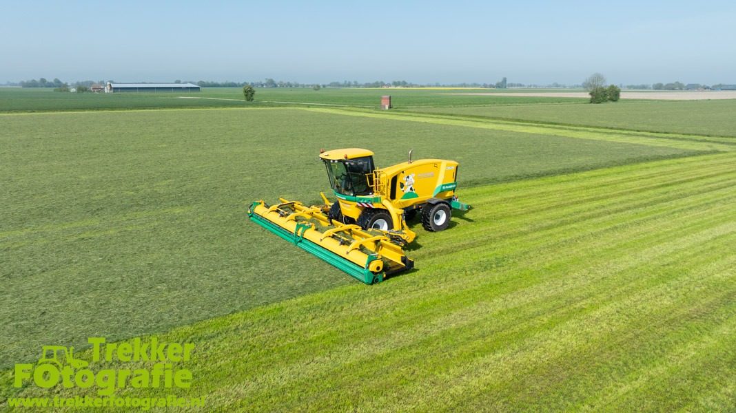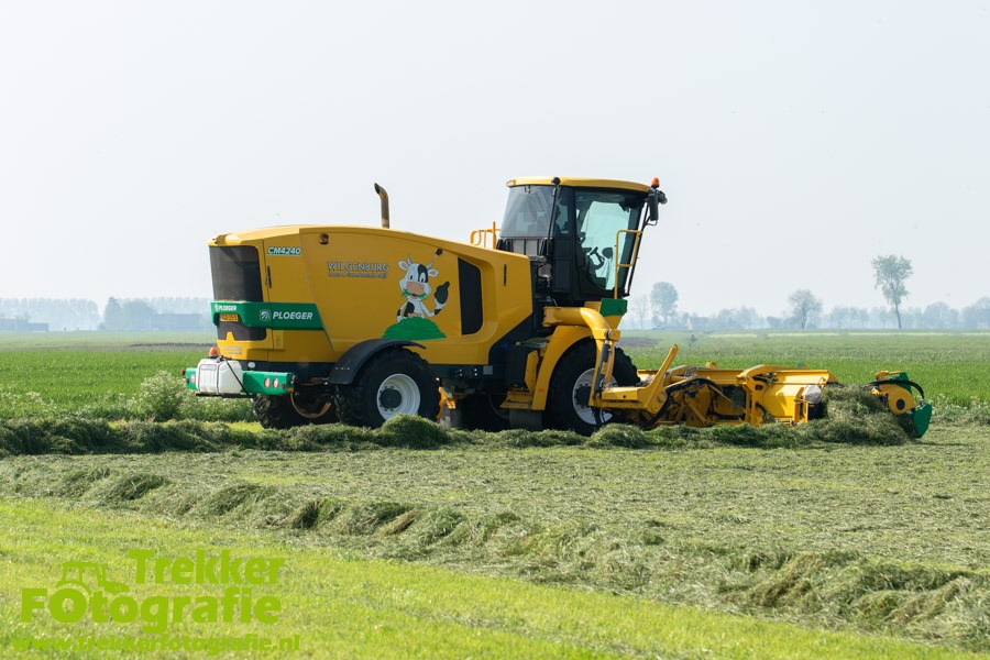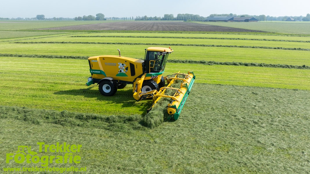 Het gras werd geharkt op een zwad van 22 meter gras bij elkaar met hun Ploeger CM4240 zelfrijdende bandhark.