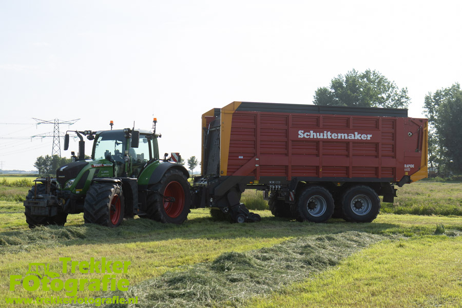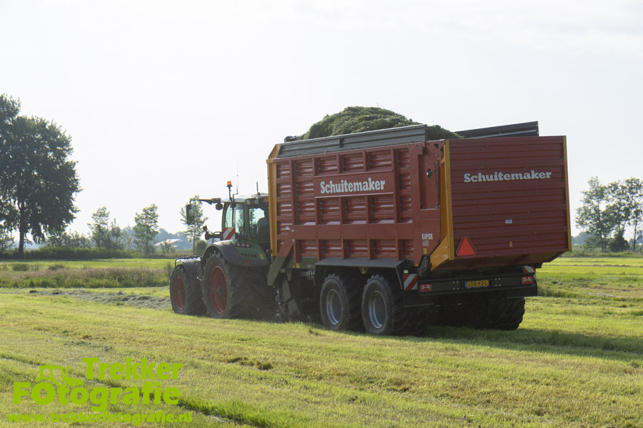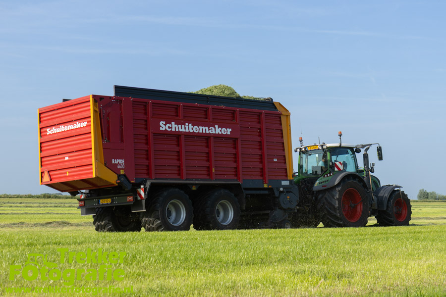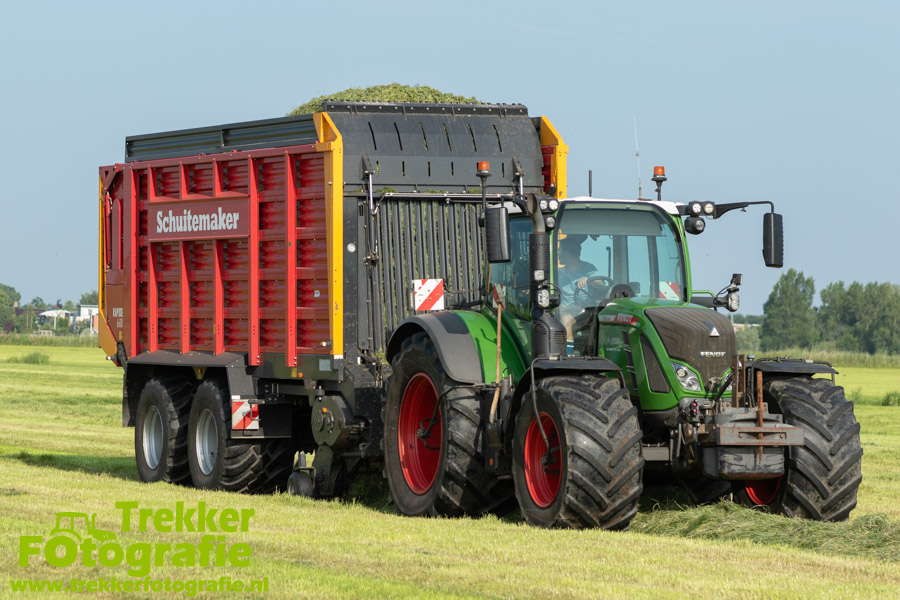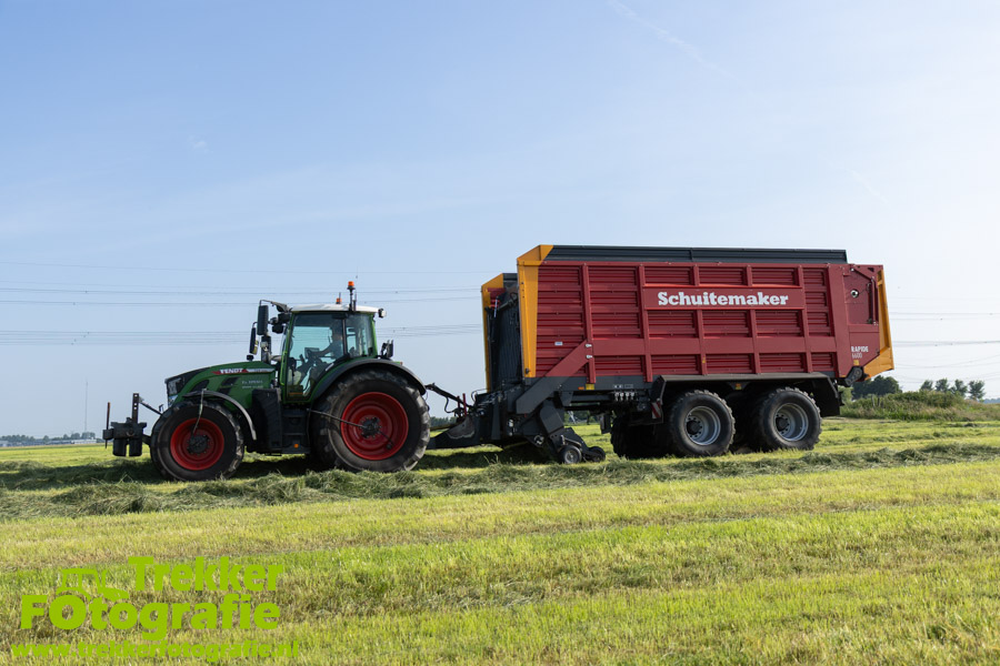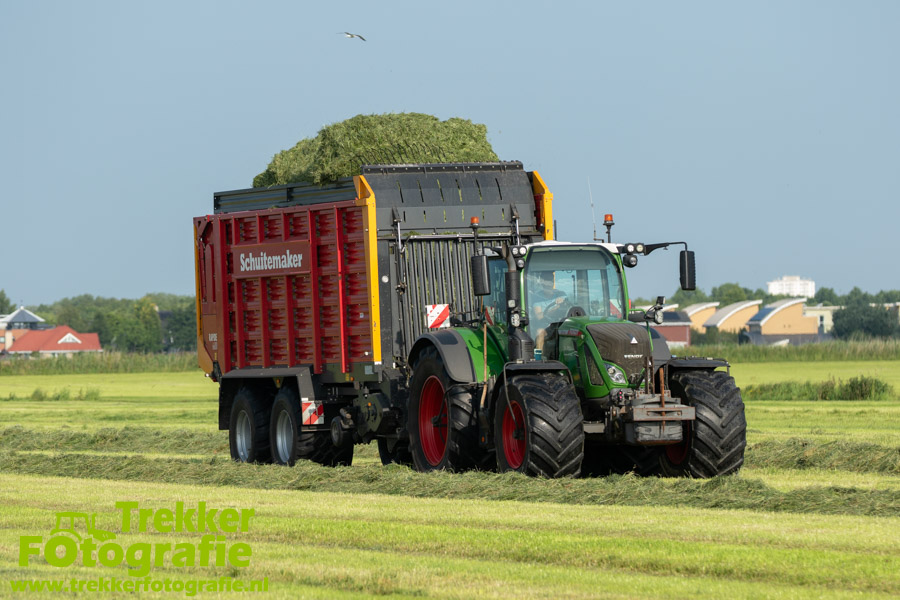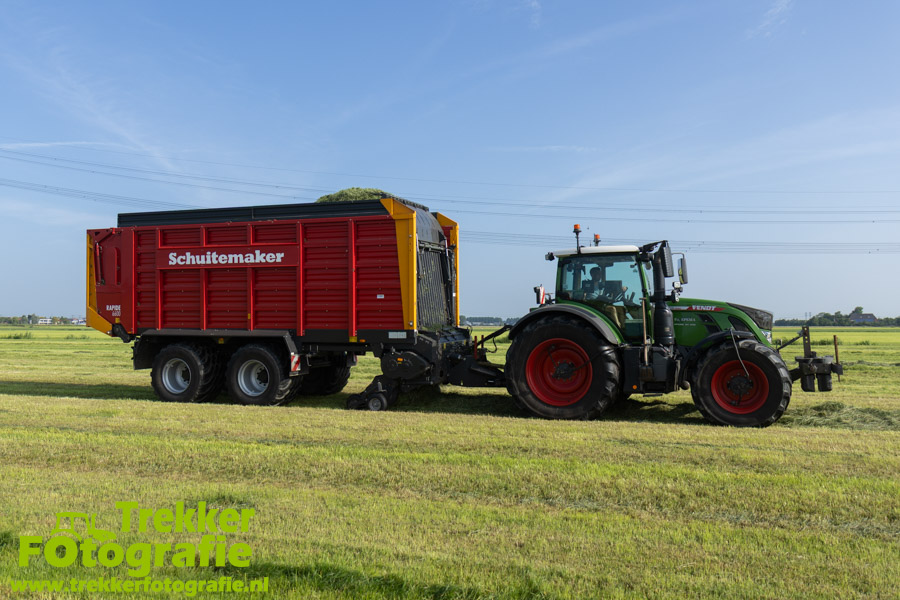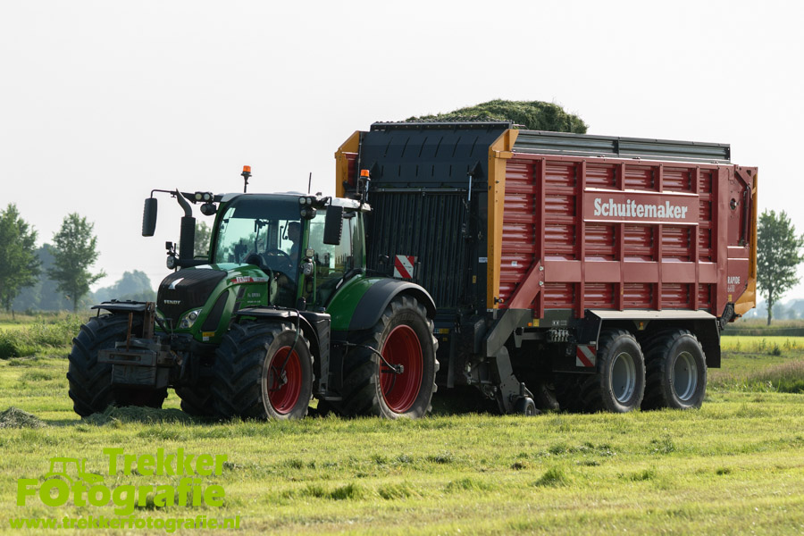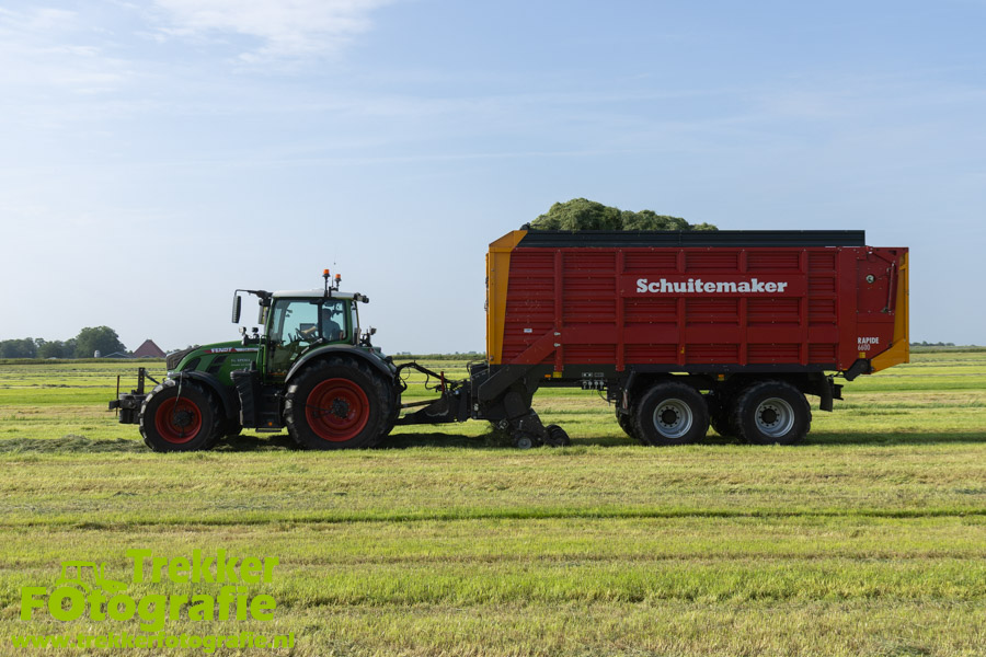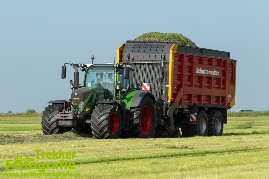 Dit jaar namen wij ook eens een kijkje bij het gras inkuilen door loonbedrijf Fa Epema. Het inkuilen van het gras werd gedaan met hun Fendt 724 Vario met een Schuitemaker Rapide 6600 opraapwagen.
