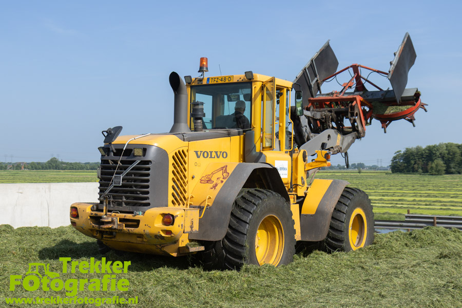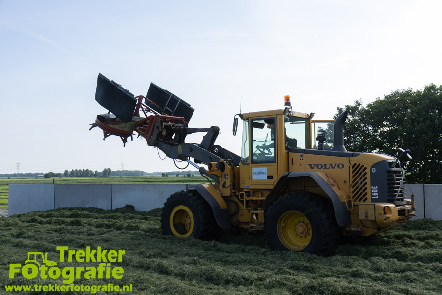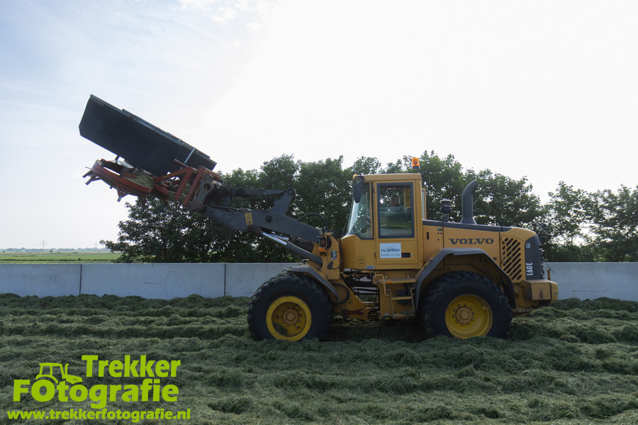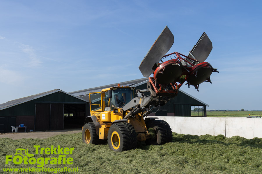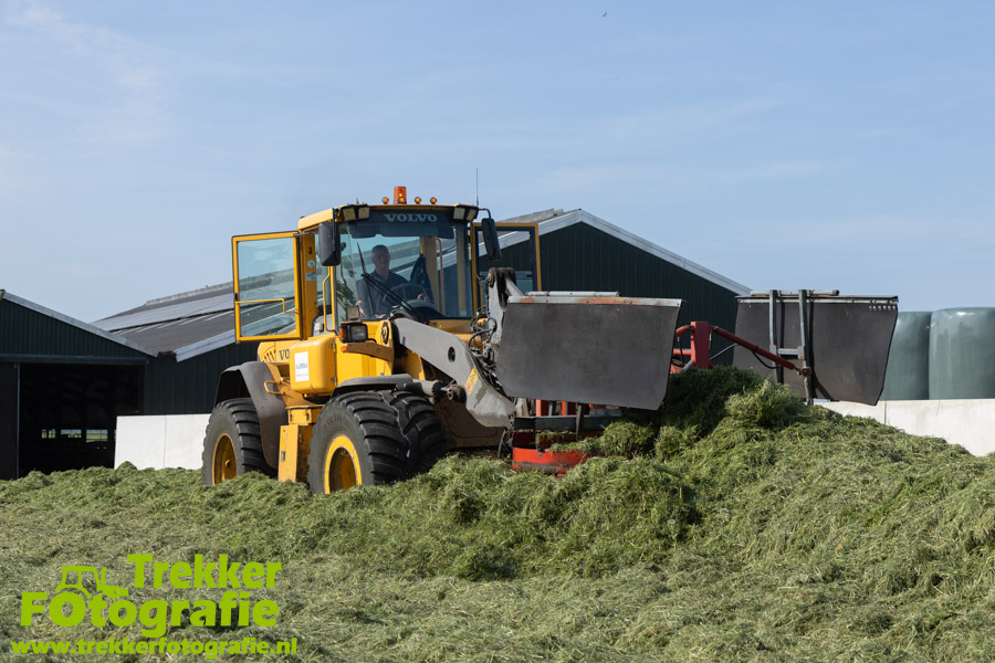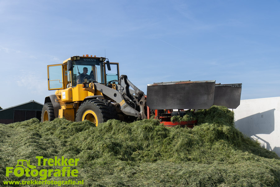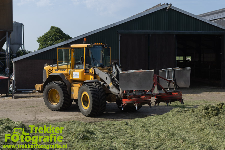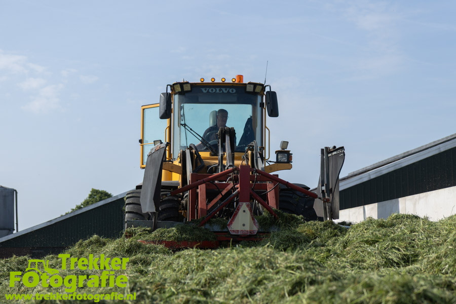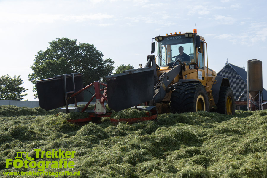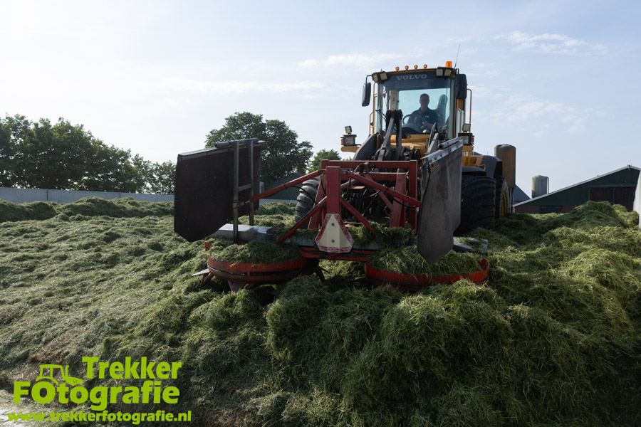 Bij de boerderij werd het gras in een grote sleufsilo verdeeld en aangereden met hun Volvo L60E met een Vliebo Super kuilverdeler.