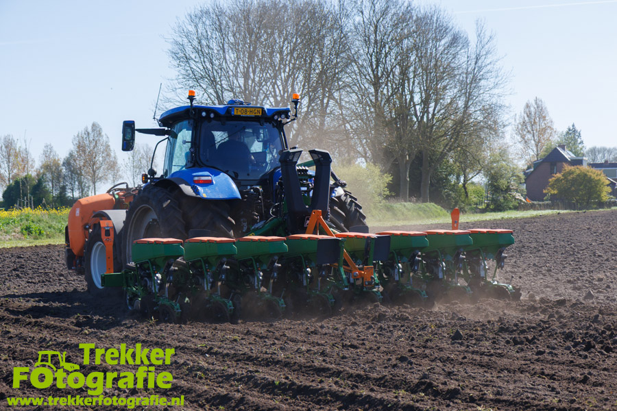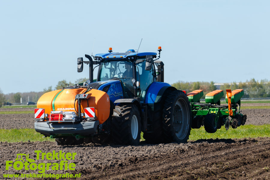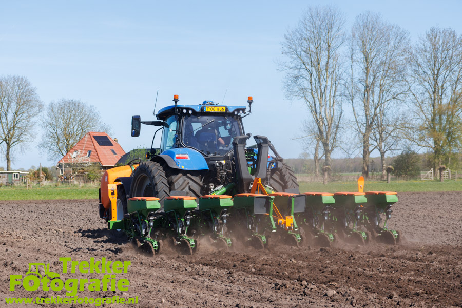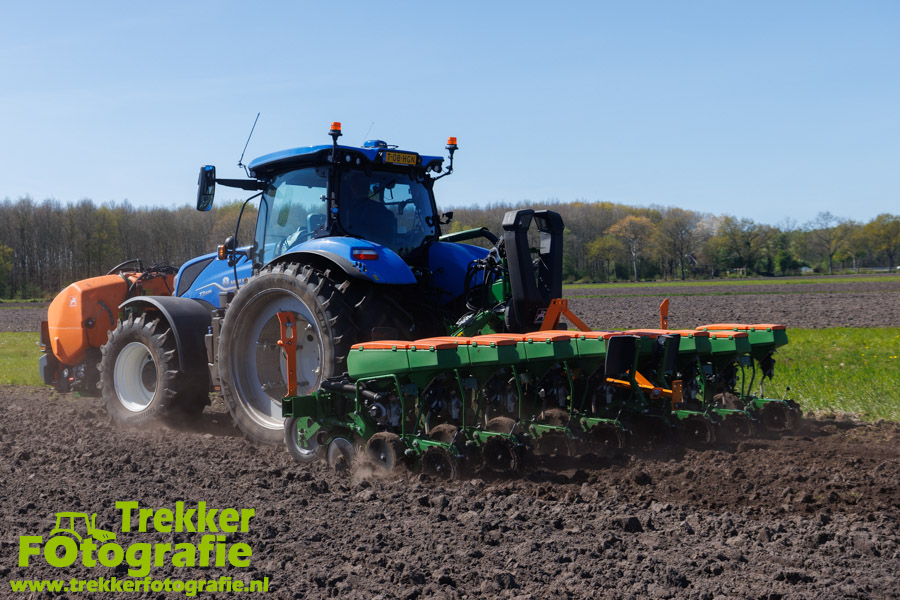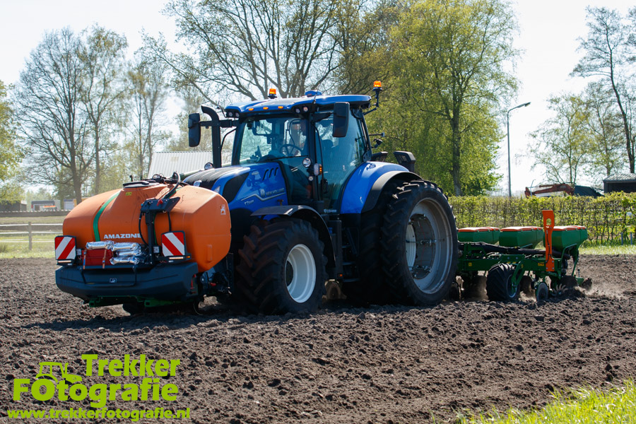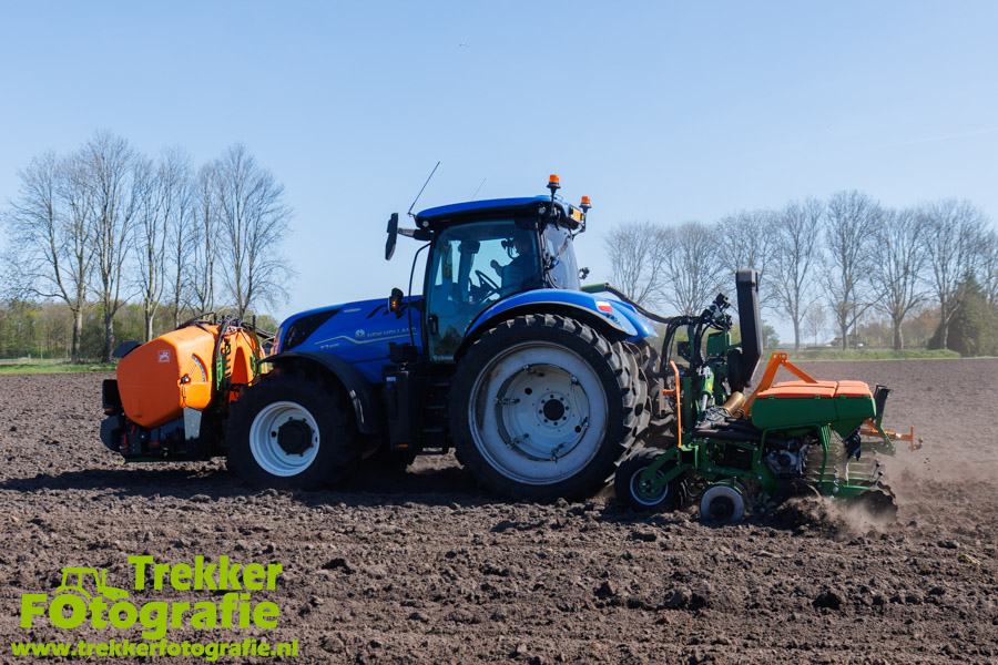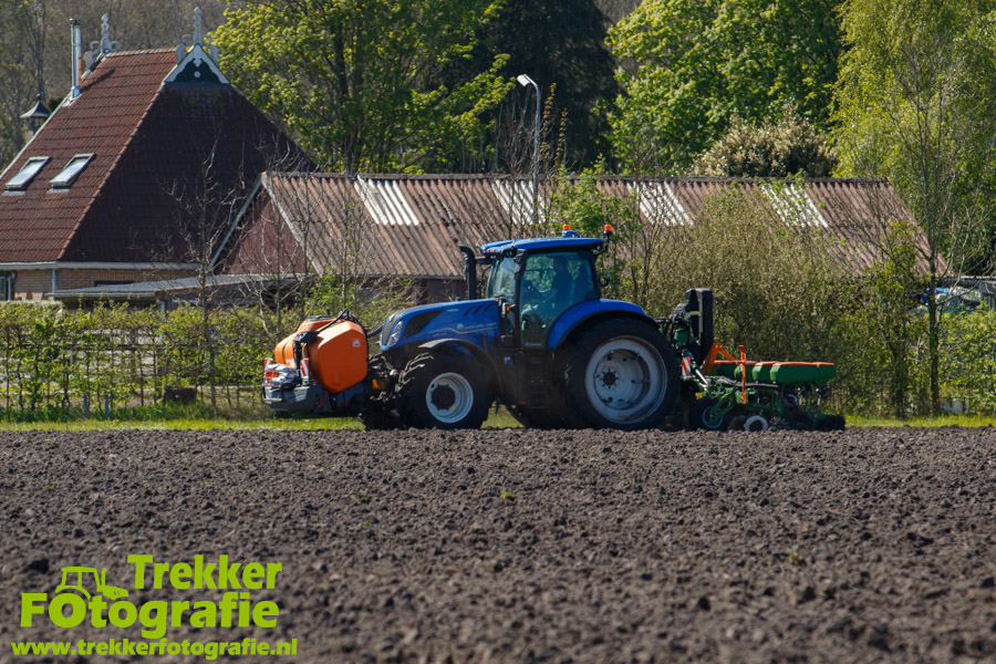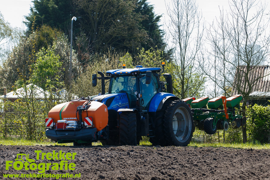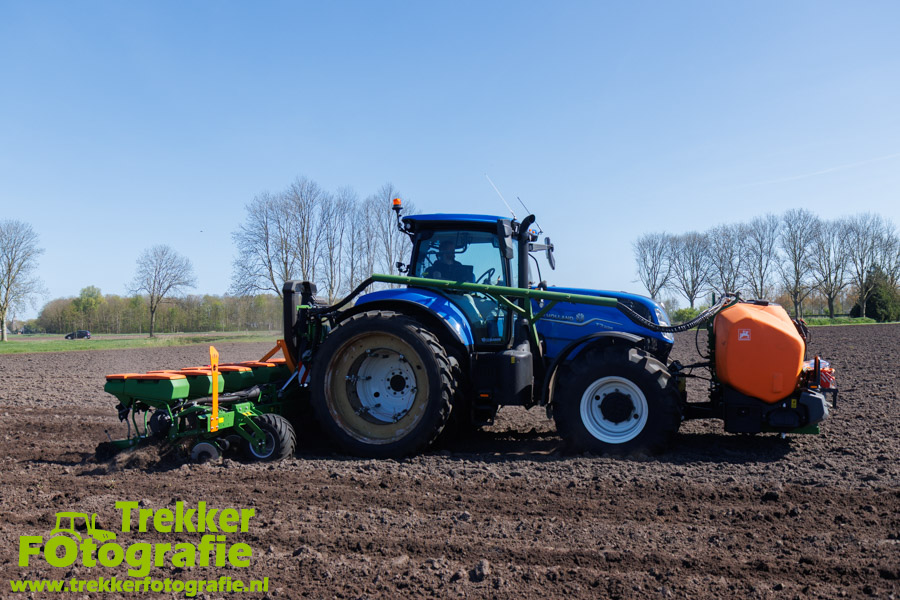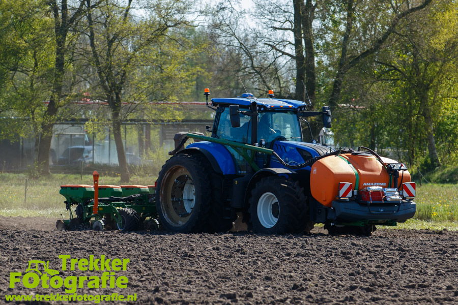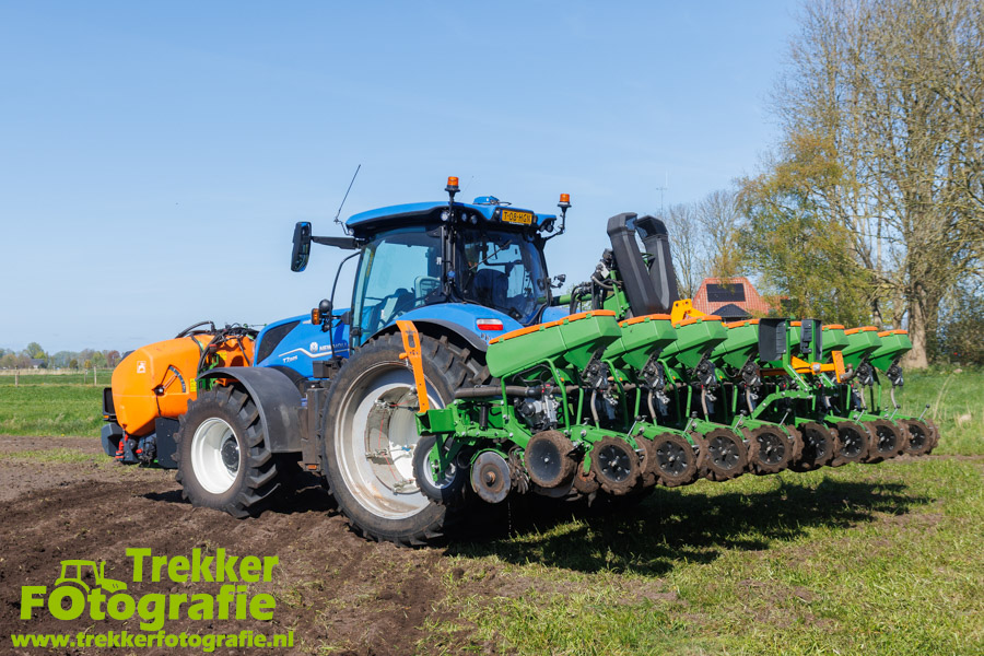 Afgelopen week namen wij een kijkje bij het maïs zaaien door loonbedrijf Lolkema, dit werd gedaan met hun nieuwe New Holland T7.225 PLM trekker met daarachter een 8-rijige Amazone Precea 6000-2FCC maïszaaier en voorop de trekker een Amazone FT-P 1502 fronttank.