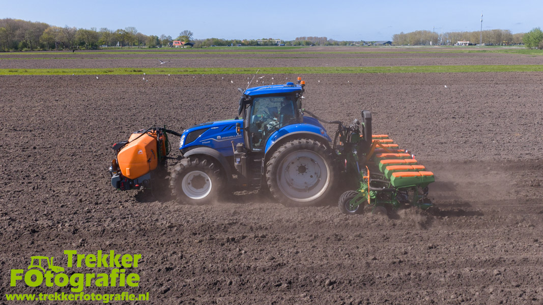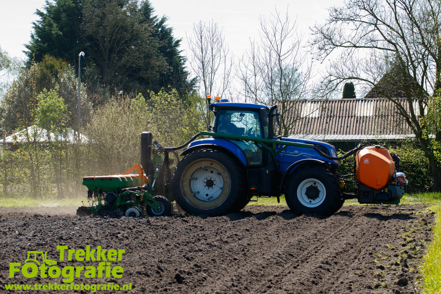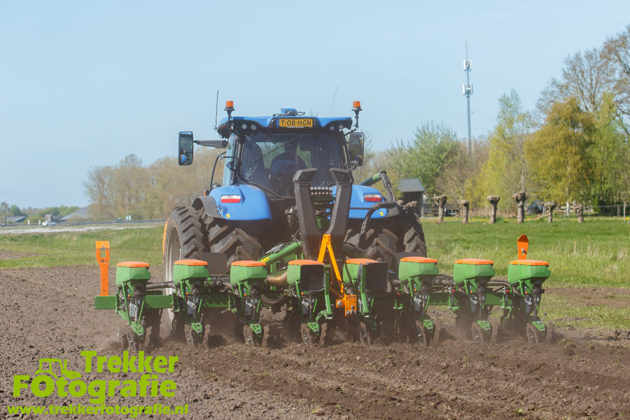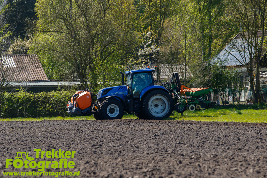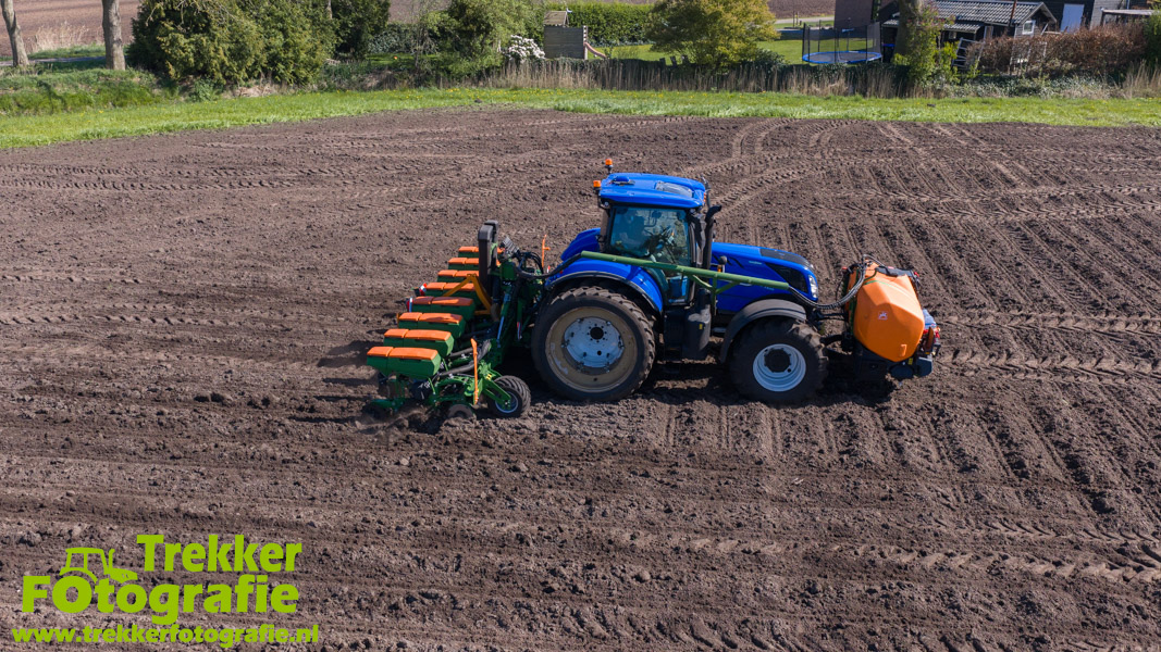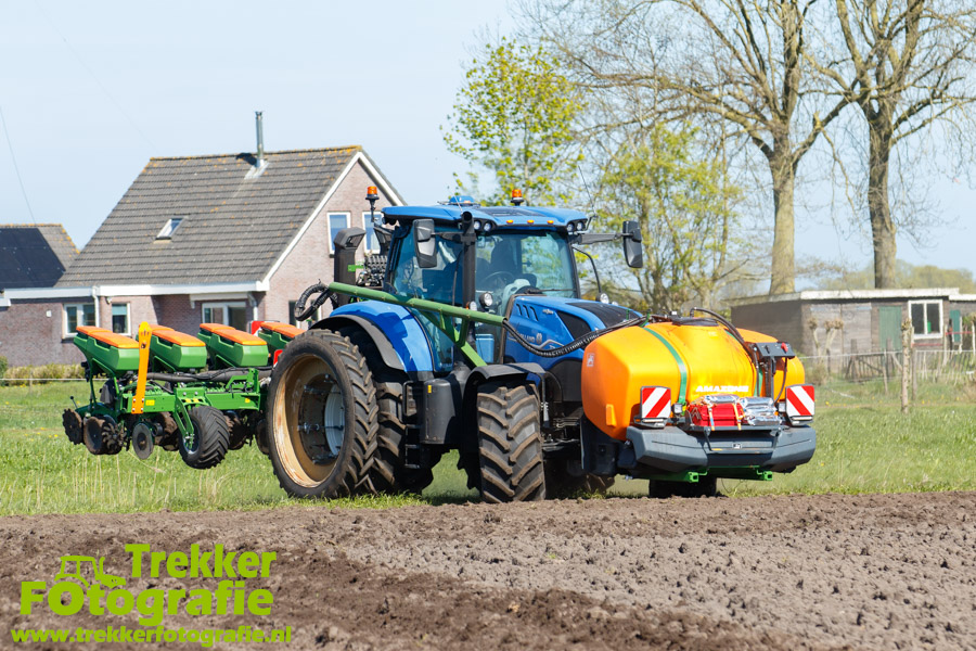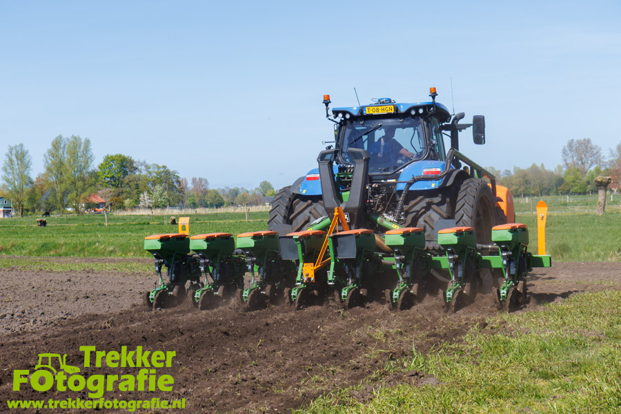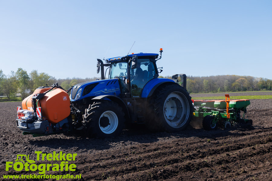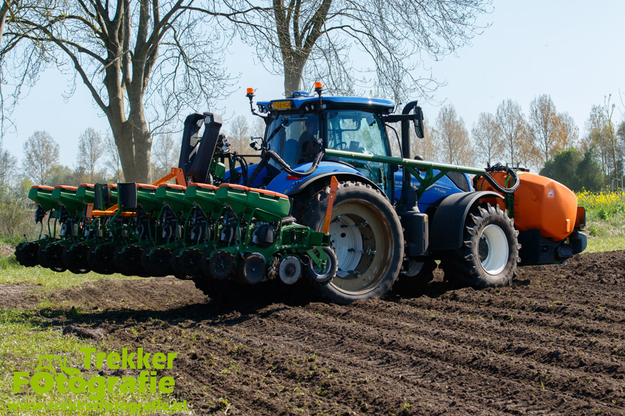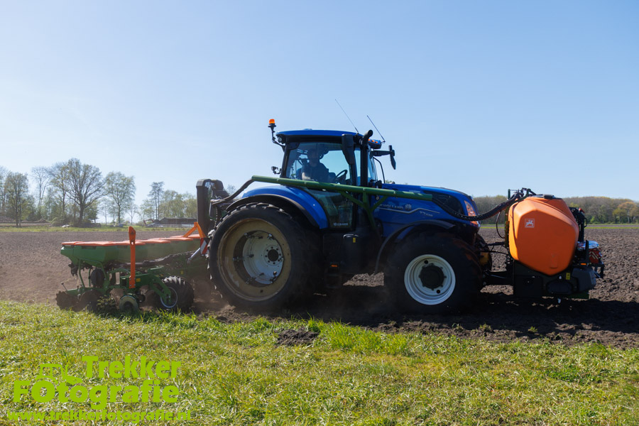 Afgelopen week namen wij een kijkje bij het maïs zaaien door loonbedrijf Lolkema, dit werd gedaan met hun nieuwe New Holland T7.225 PLM trekker met daarachter een 8-rijige Amazone Precea 6000-2FCC maïszaaier en voorop de trekker een Amazone FT-P 1502 fronttank.
