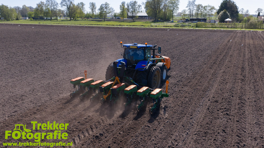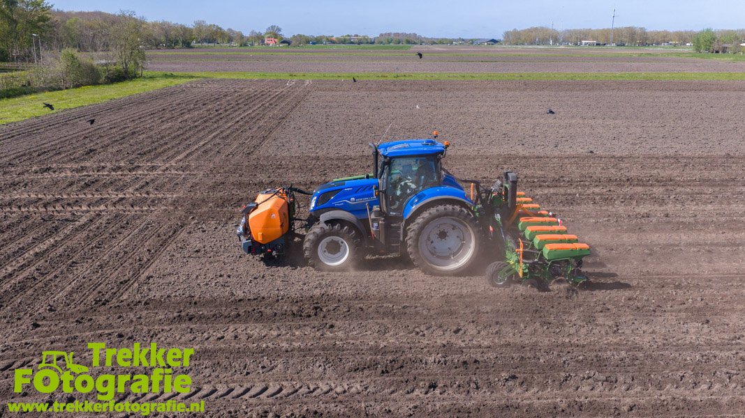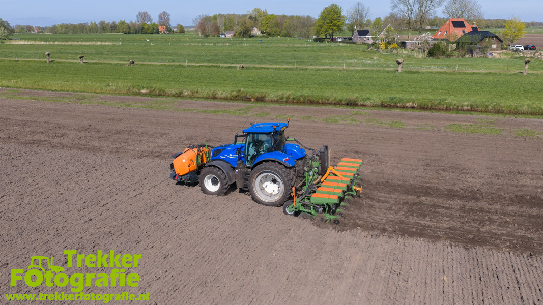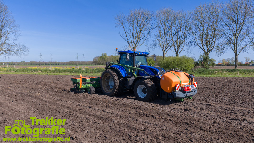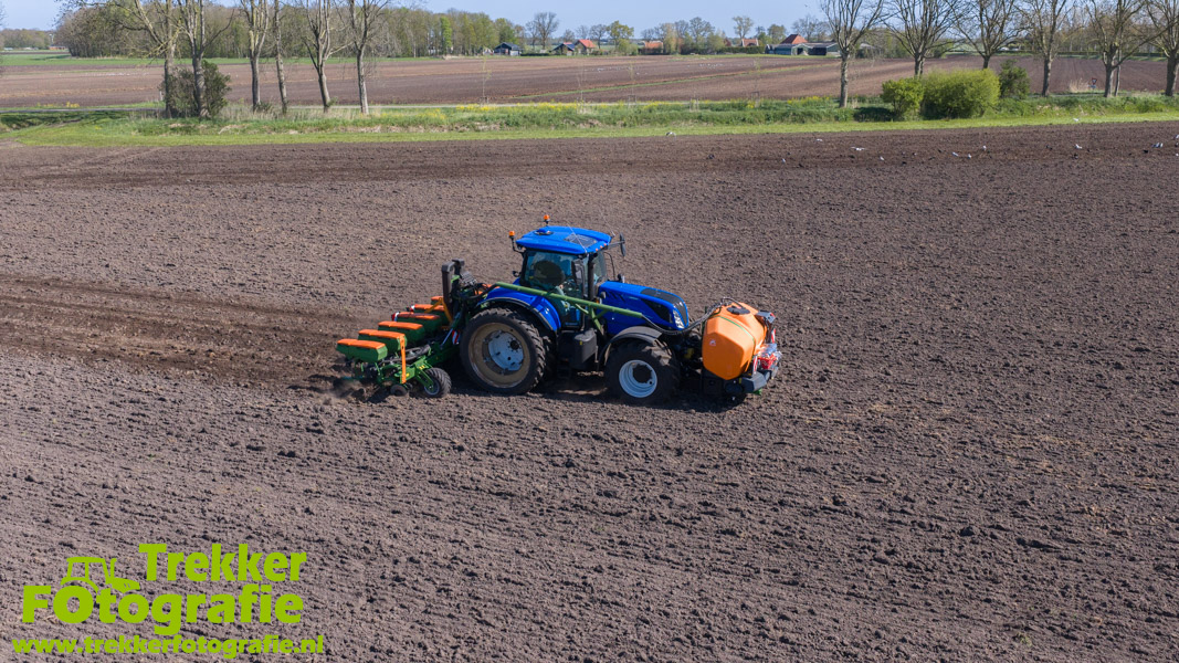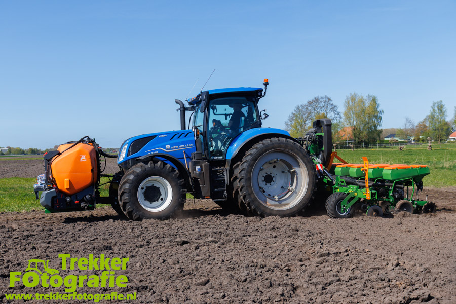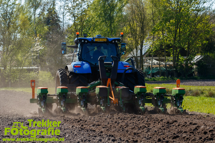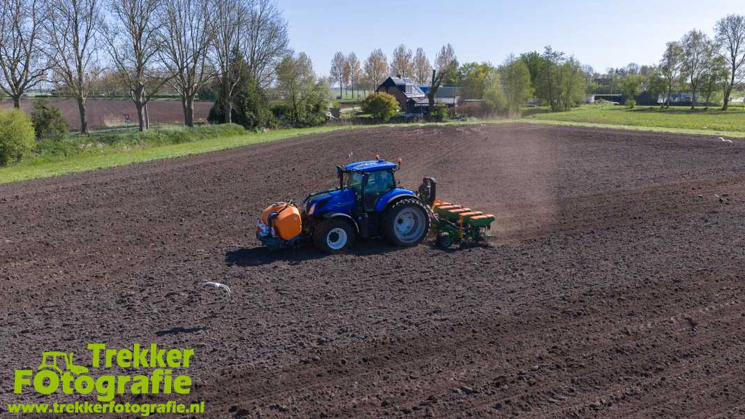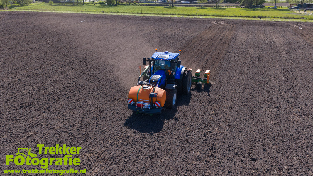Afgelopen week namen wij een kijkje bij het maïs zaaien door loonbedrijf Lolkema, dit werd gedaan met hun nieuwe New Holland T7.225 PLM trekker met daarachter een 8-rijige Amazone Precea 6000-2FCC maïszaaier en voorop de trekker een Amazone FT-P 1502 fronttank.