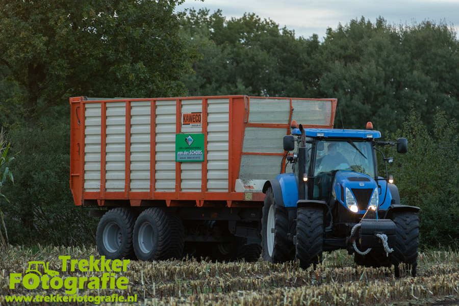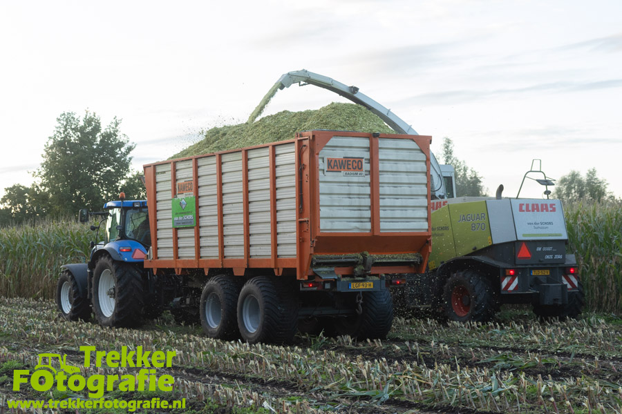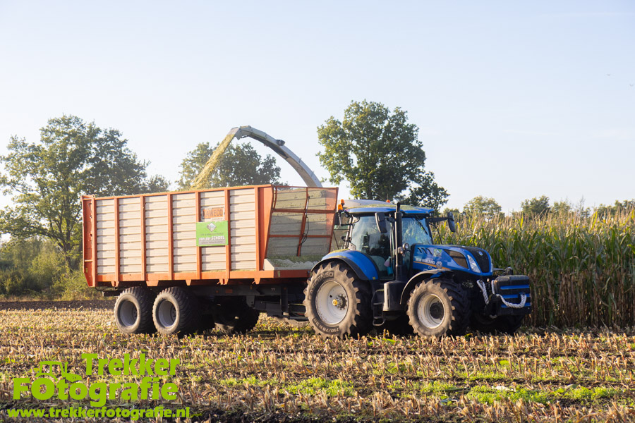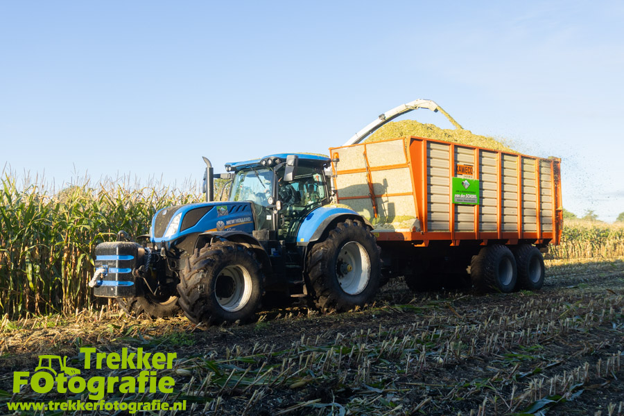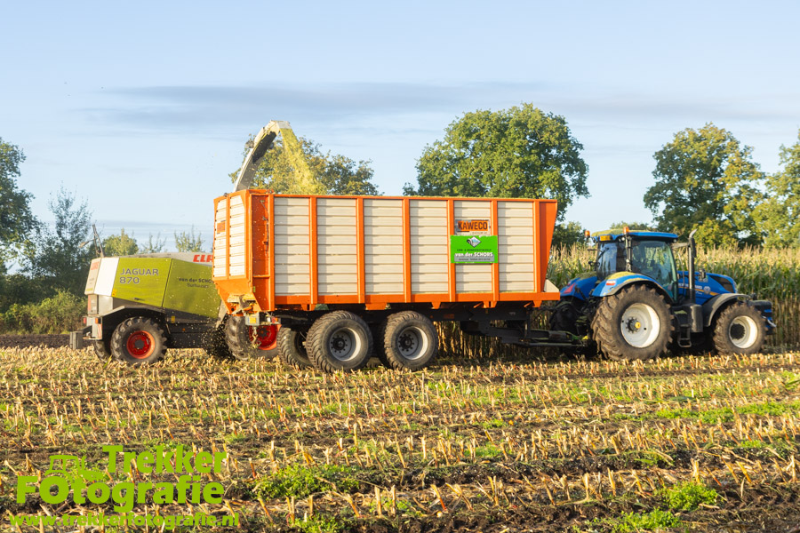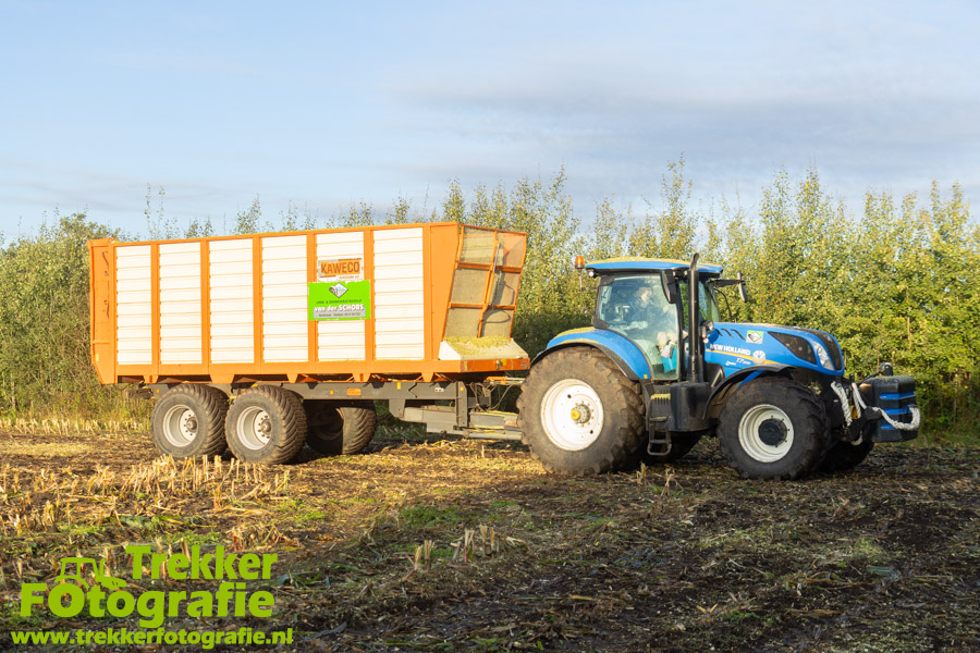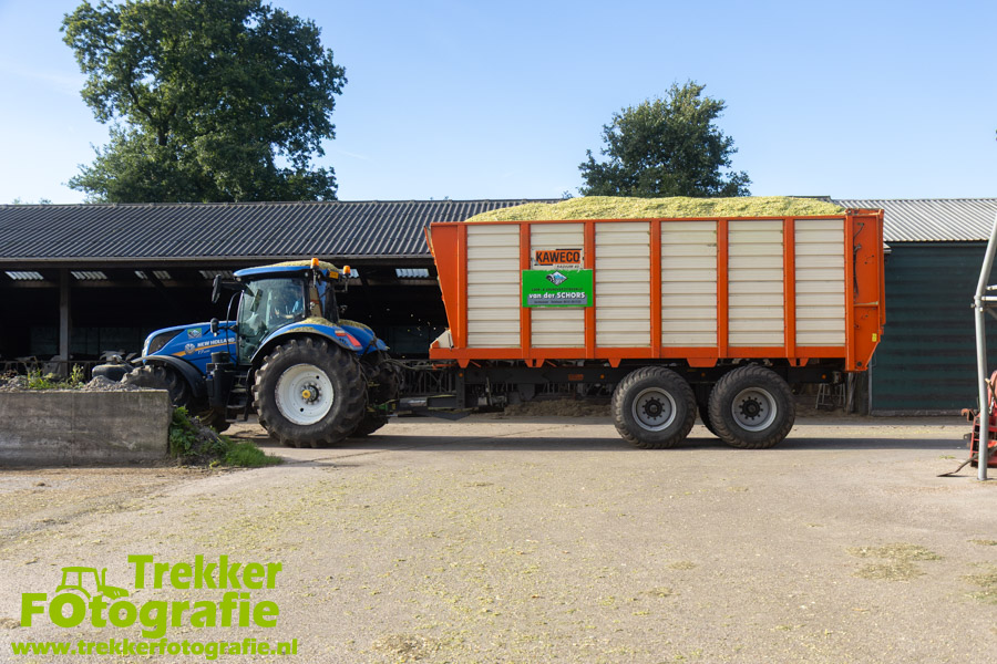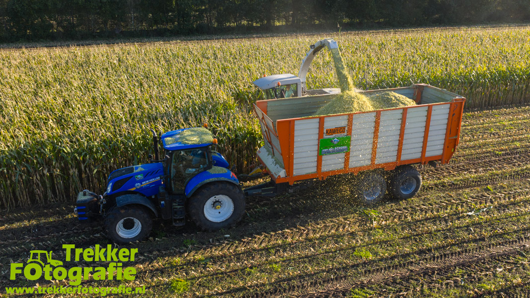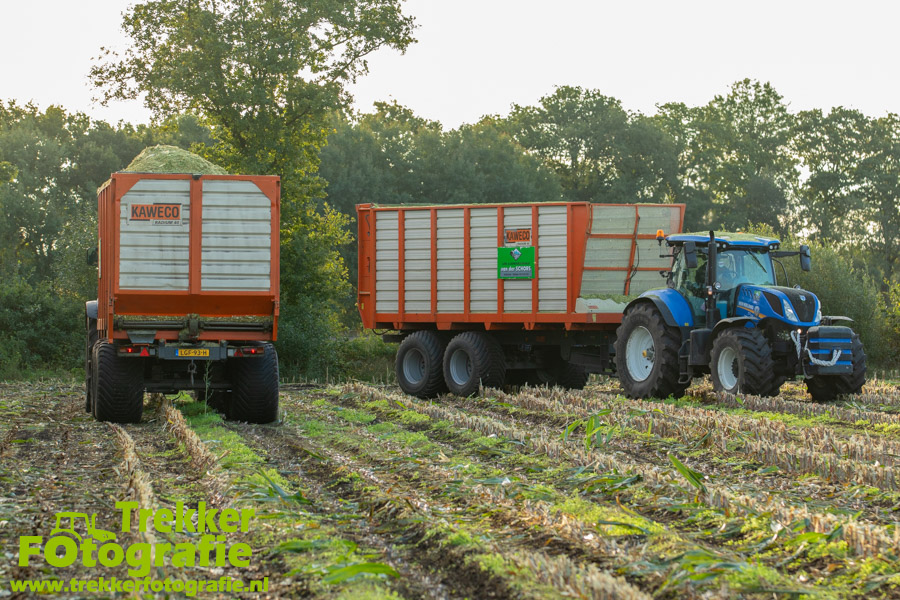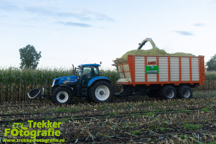 Twee weken geleden namen wij een kijkje bij het maïs hakselen door loonbedrijf van der Schors. Ze waren aan het maïs hakselen met hun Claas Jaguar 870 hakselaar met een Kemper 360 voorzetstuk. Onder de pijp reden hun New Holland T7.230 met een Kaweco Radium 40 en hun New Holland T7030 met eveneens een Kaweco Radium 40.