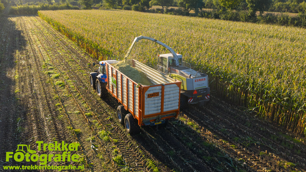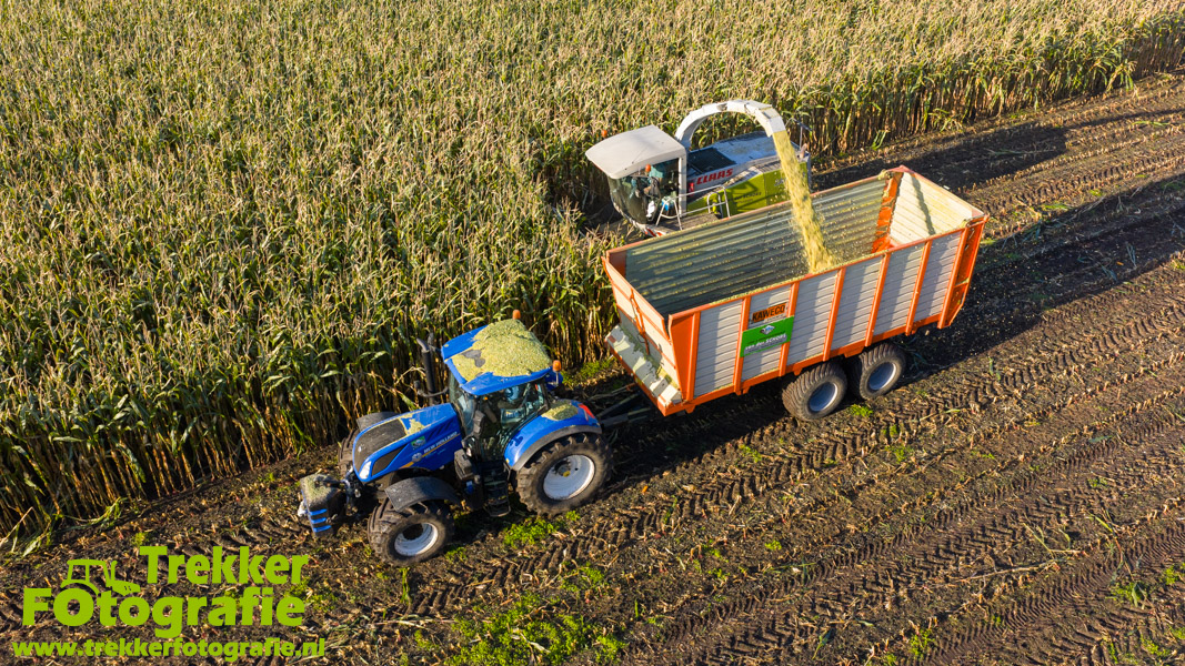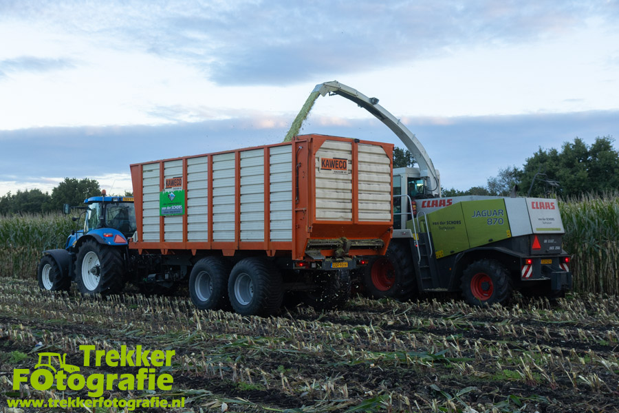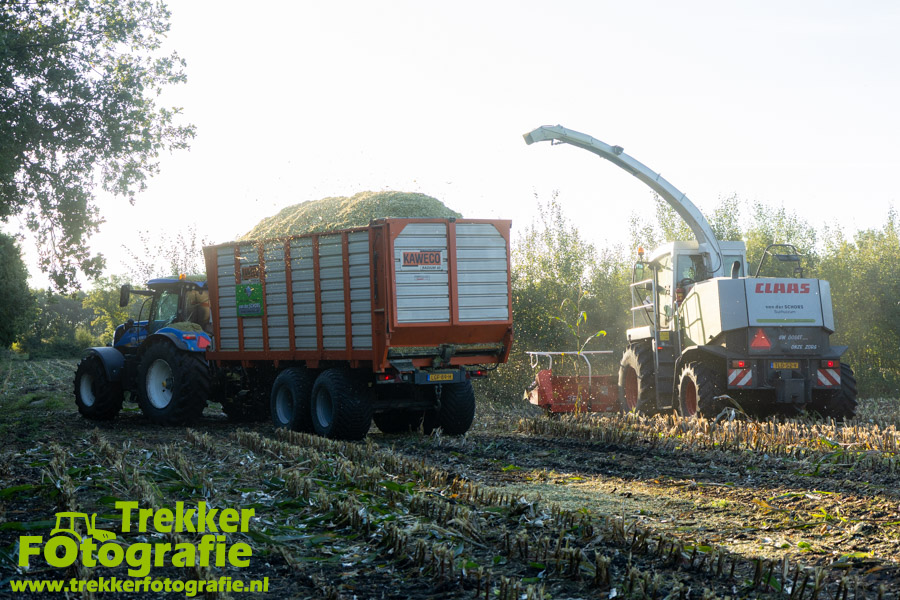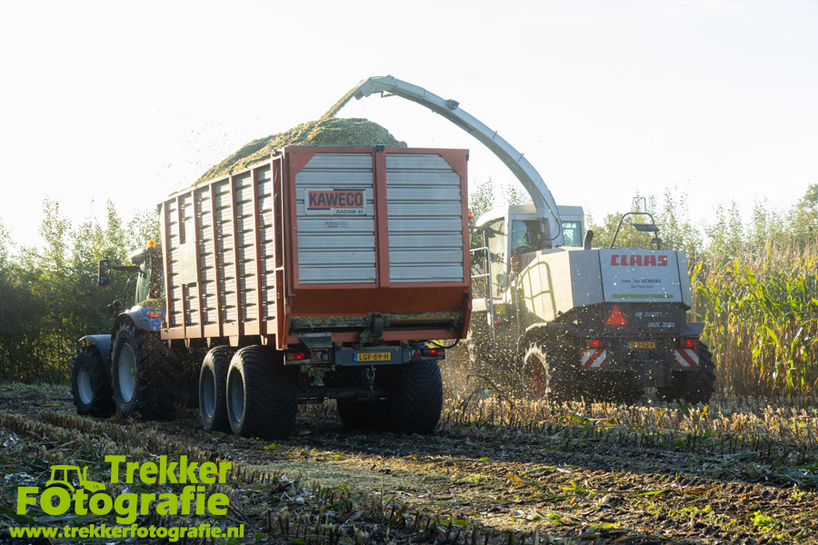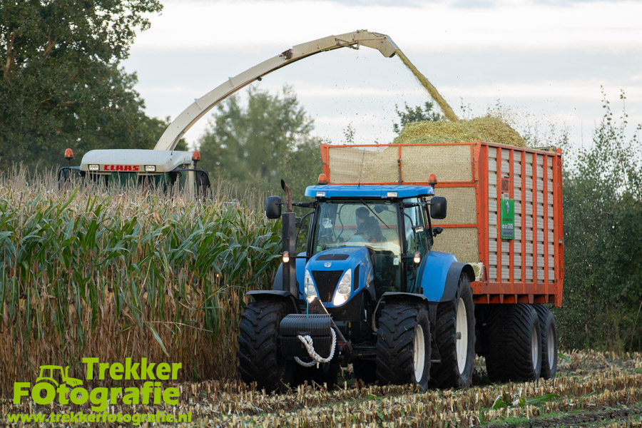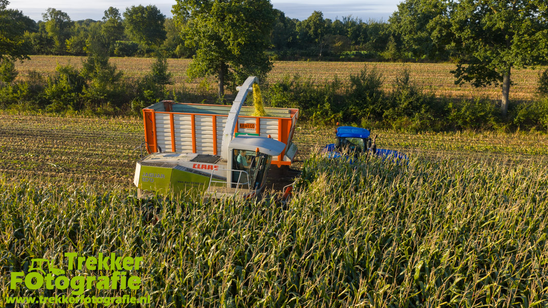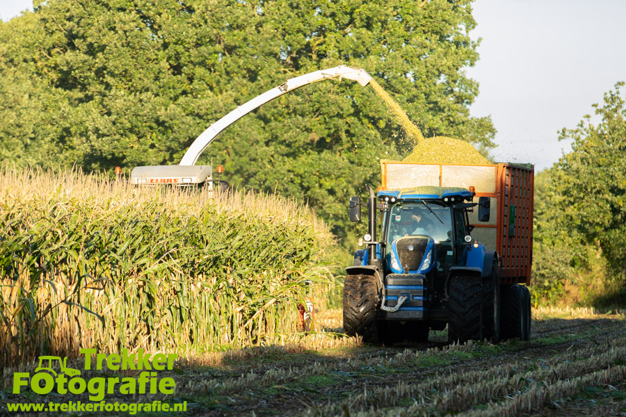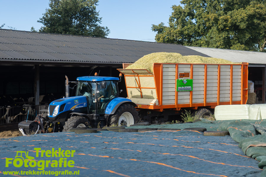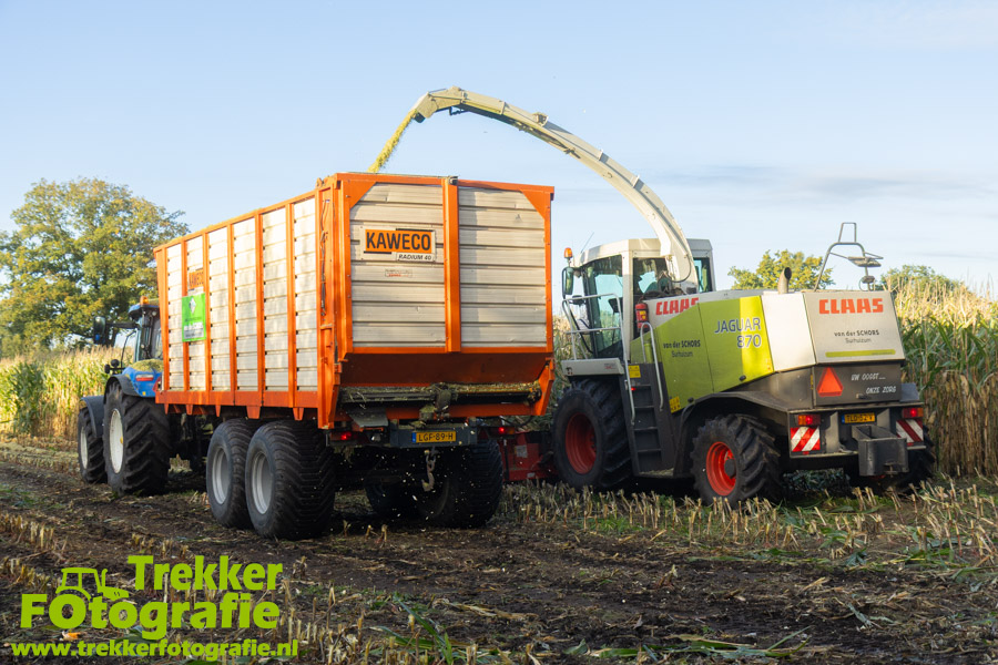 Twee weken geleden namen wij een kijkje bij het maïs hakselen door loonbedrijf van der Schors. Ze waren aan het maïs hakselen met hun Claas Jaguar 870 hakselaar met een Kemper 360 voorzetstuk. Onder de pijp reden hun New Holland T7.230 met een Kaweco Radium 40 en hun New Holland T7030 met eveneens een Kaweco Radium 40.