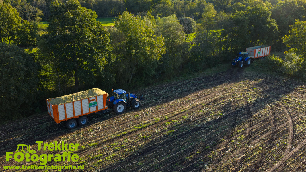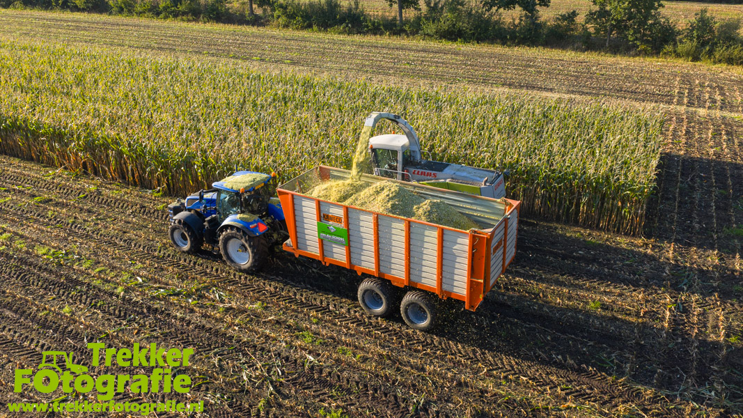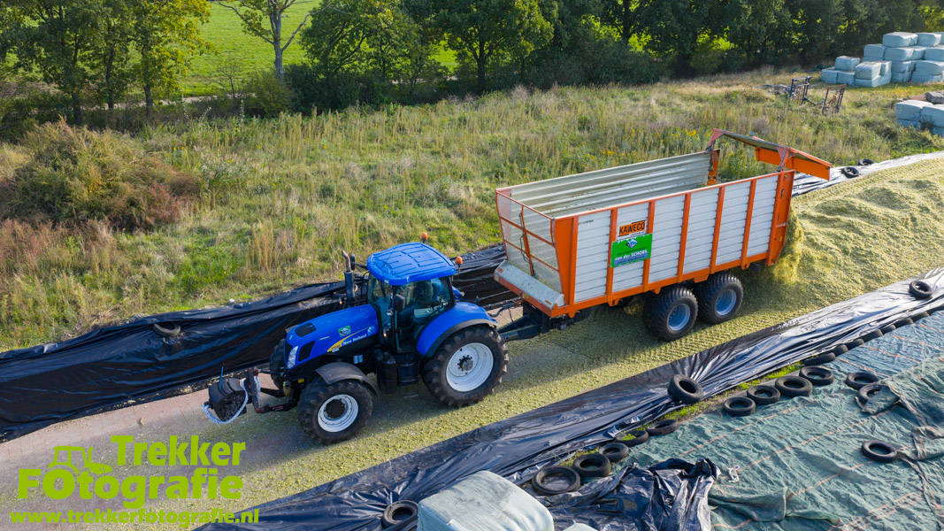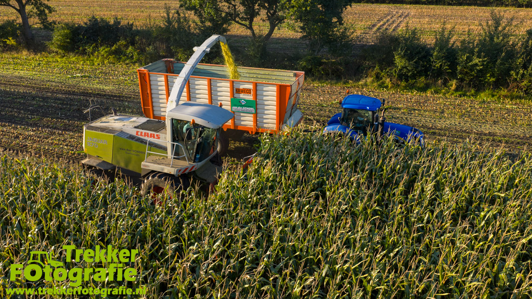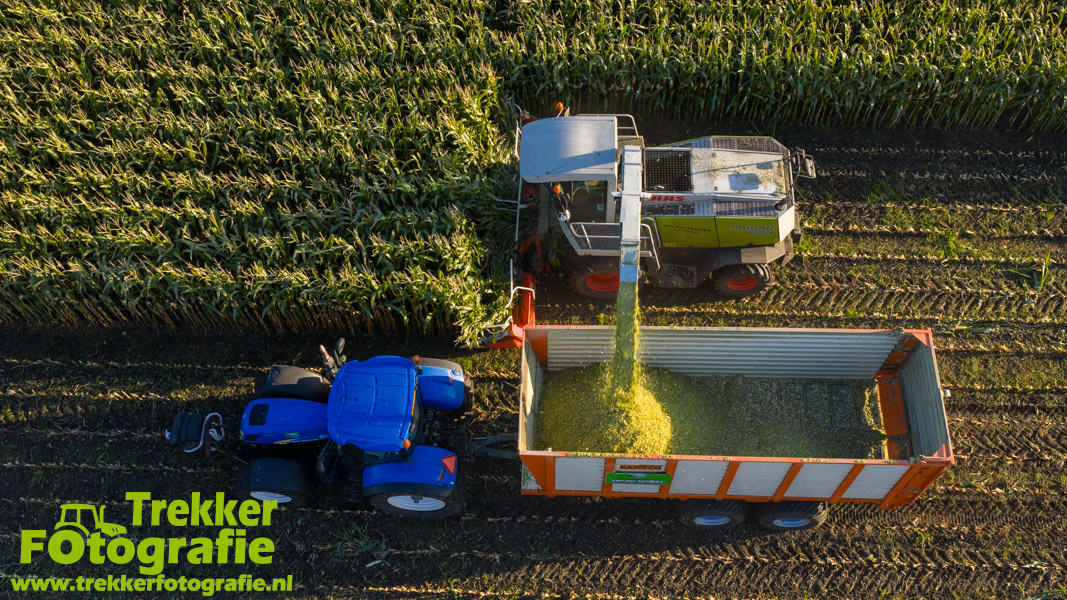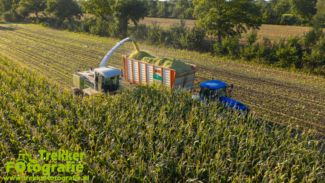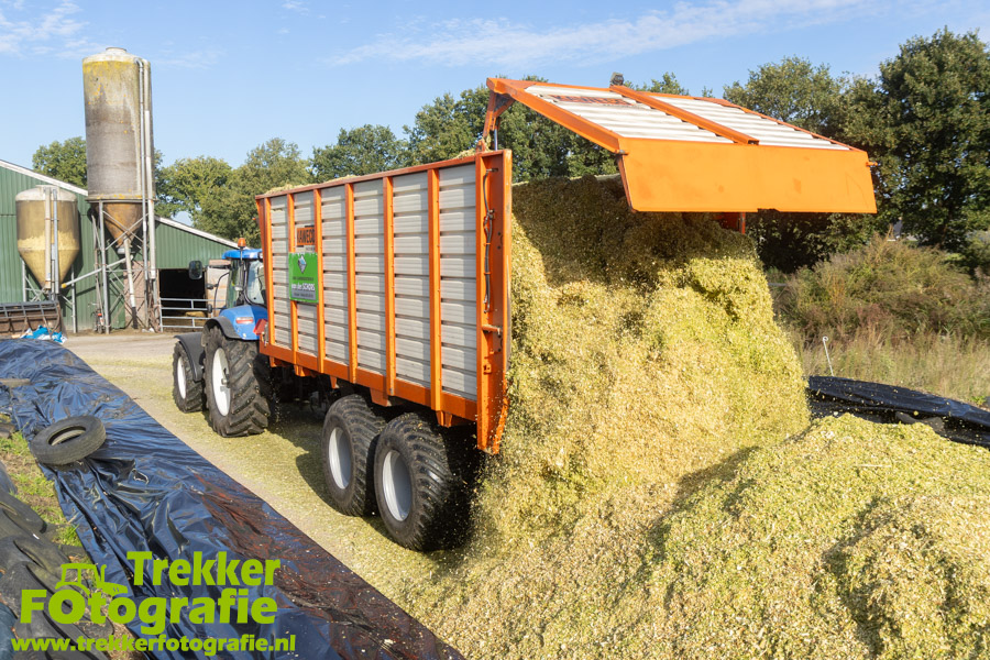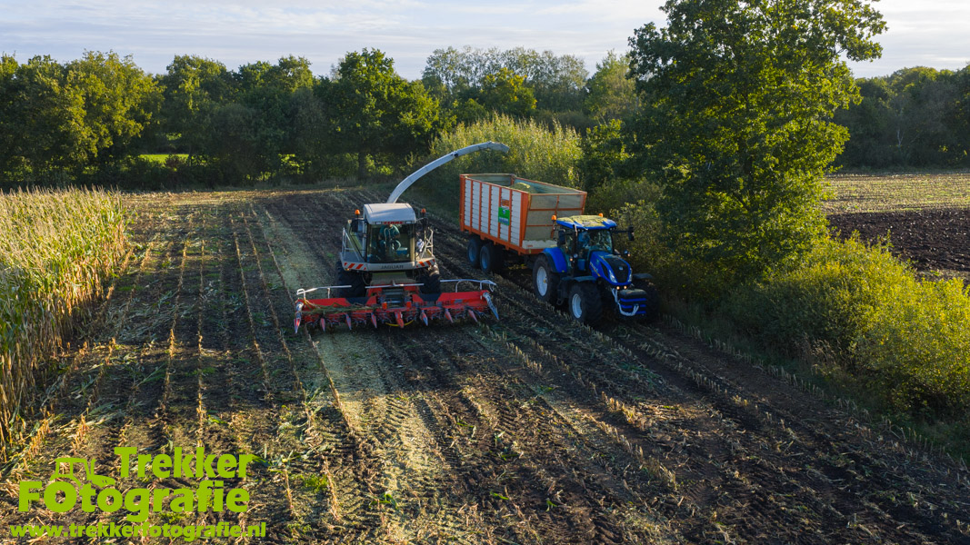 Twee weken geleden namen wij een kijkje bij het maïs hakselen door loonbedrijf van der Schors. Ze waren aan het maïs hakselen met hun Claas Jaguar 870 hakselaar met een Kemper 360 voorzetstuk. Onder de pijp reden hun New Holland T7.230 met een Kaweco Radium 40 en hun New Holland T7030 met eveneens een Kaweco Radium 40.