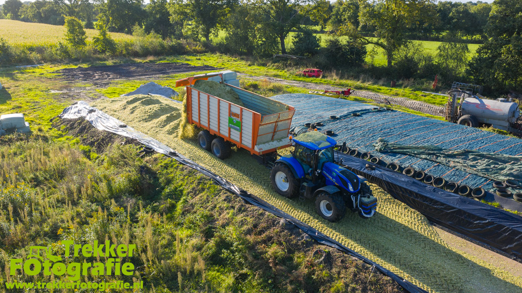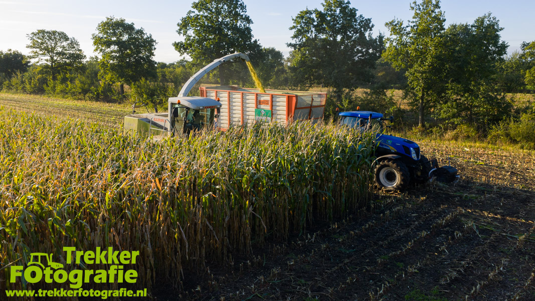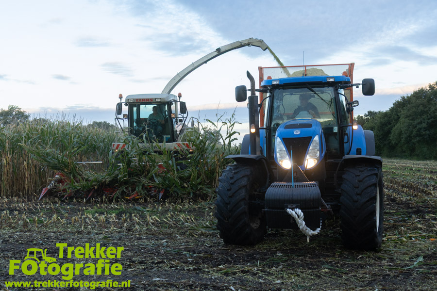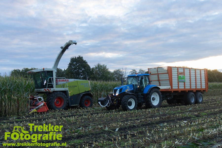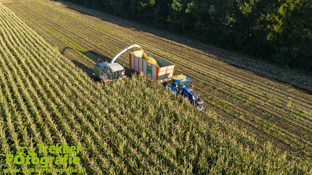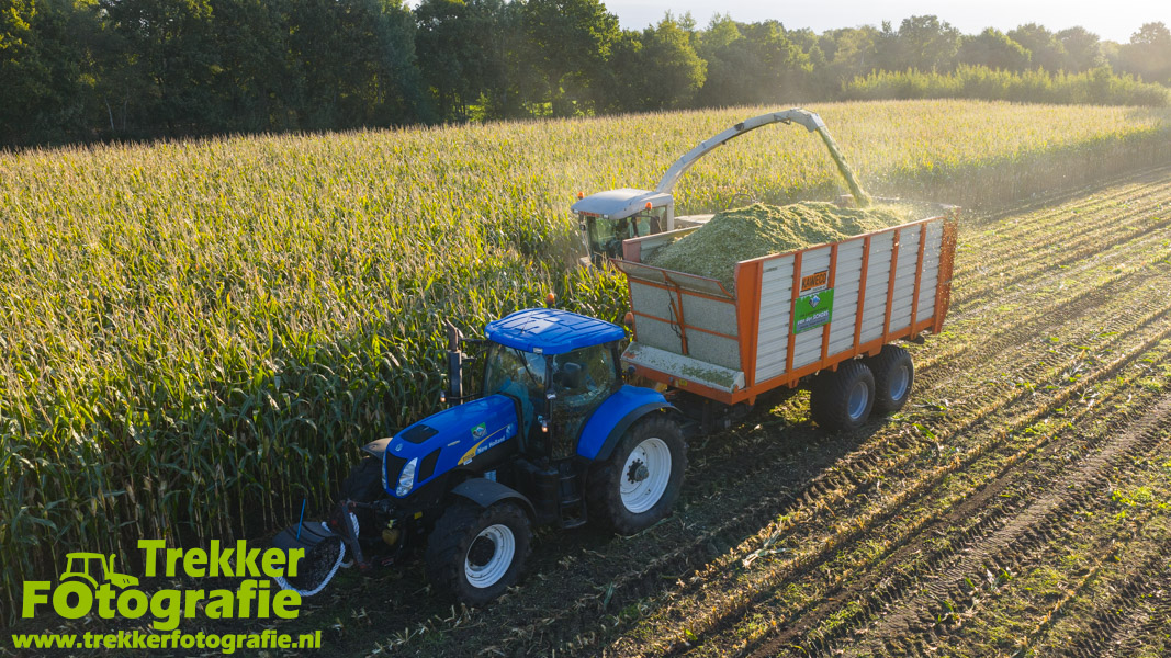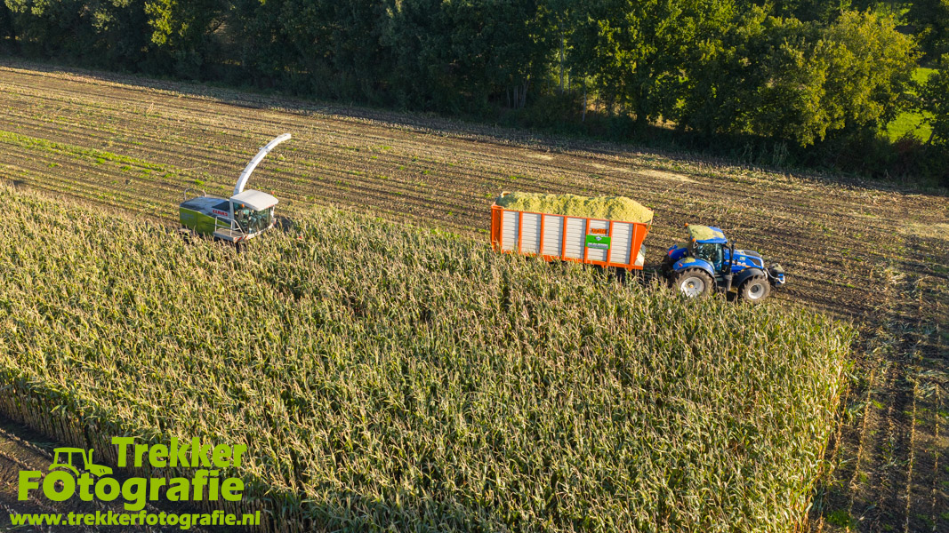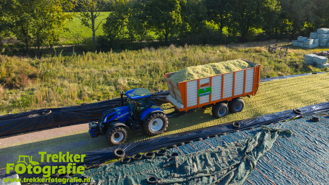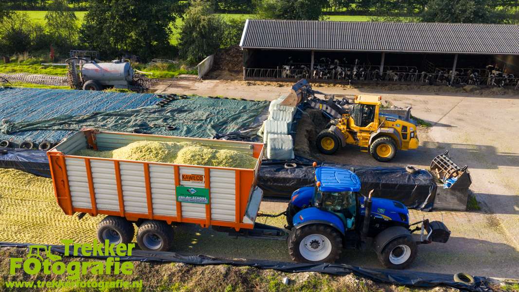 Twee weken geleden namen wij een kijkje bij het maïs hakselen door loonbedrijf van der Schors. Ze waren aan het maïs hakselen met hun Claas Jaguar 870 hakselaar met een Kemper 360 voorzetstuk. Onder de pijp reden hun New Holland T7.230 met een Kaweco Radium 40 en hun New Holland T7030 met eveneens een Kaweco Radium 40.