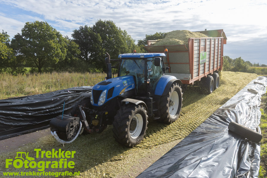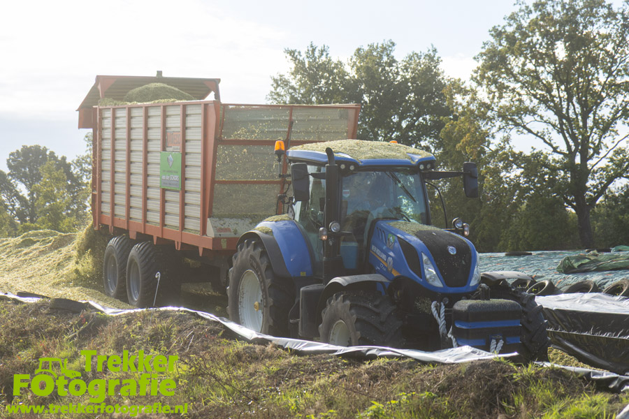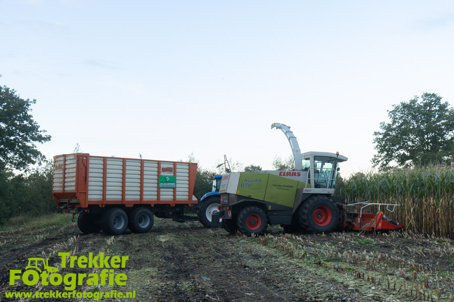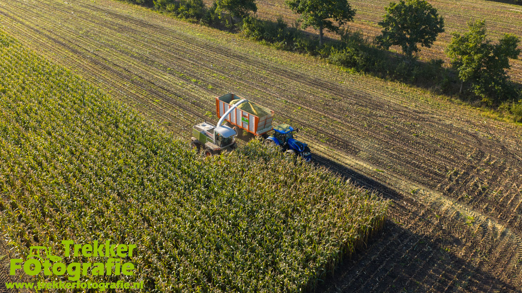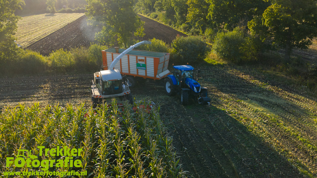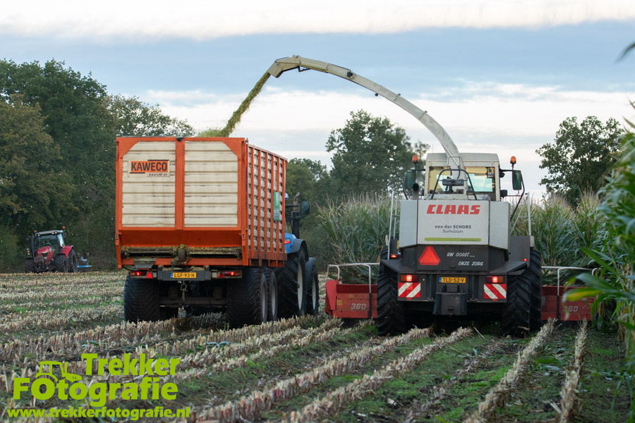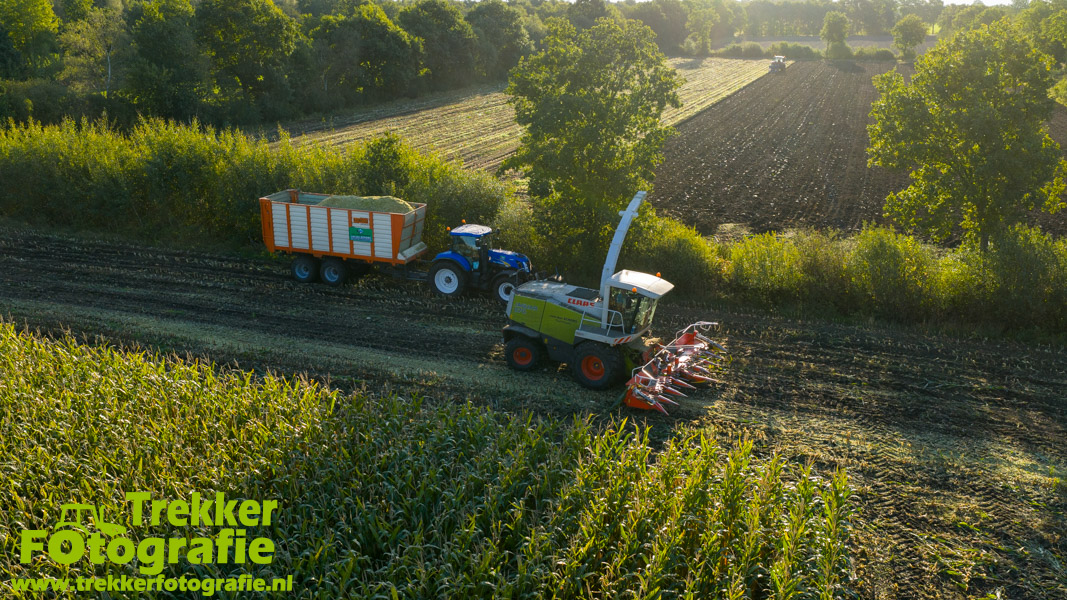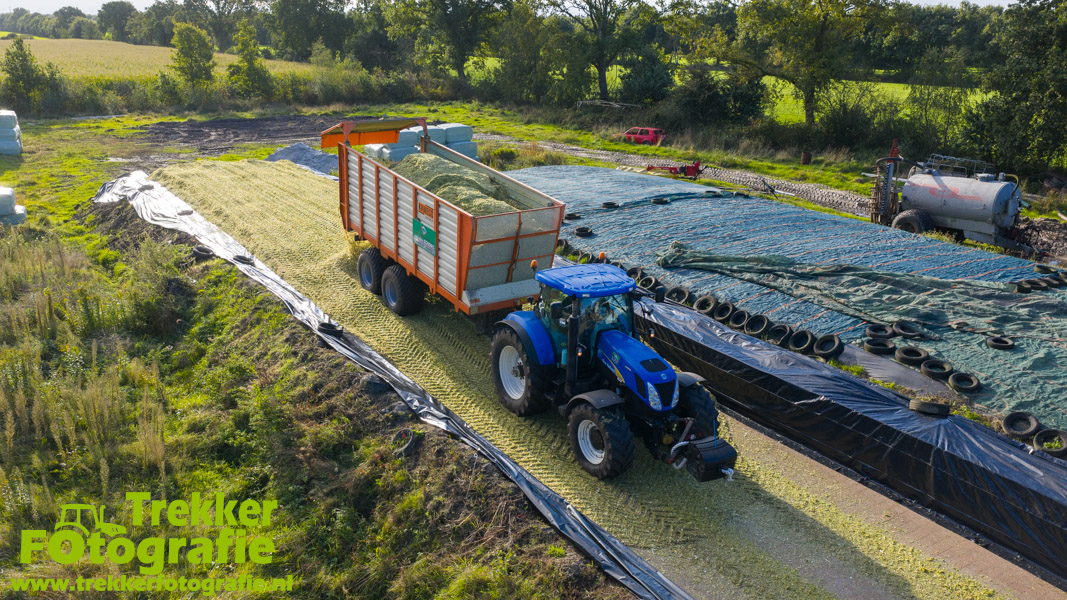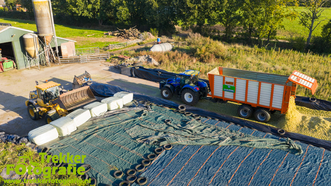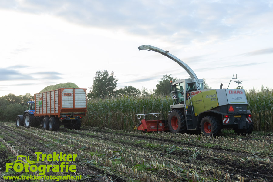 Twee weken geleden namen wij een kijkje bij het maïs hakselen door loonbedrijf van der Schors. Ze waren aan het maïs hakselen met hun Claas Jaguar 870 hakselaar met een Kemper 360 voorzetstuk. Onder de pijp reden hun New Holland T7.230 met een Kaweco Radium 40 en hun New Holland T7030 met eveneens een Kaweco Radium 40.