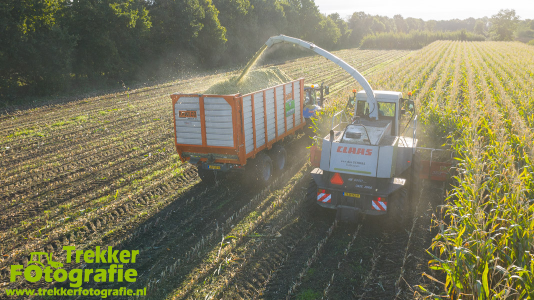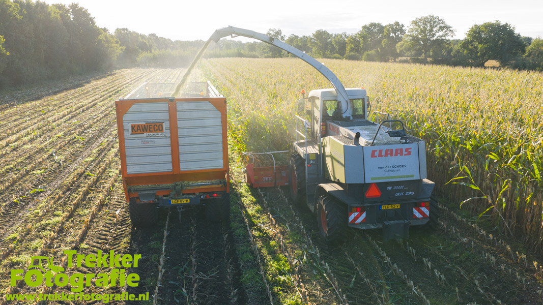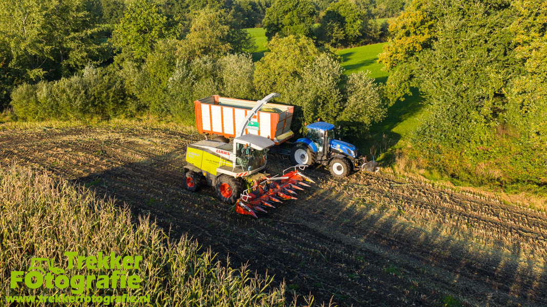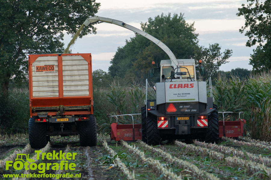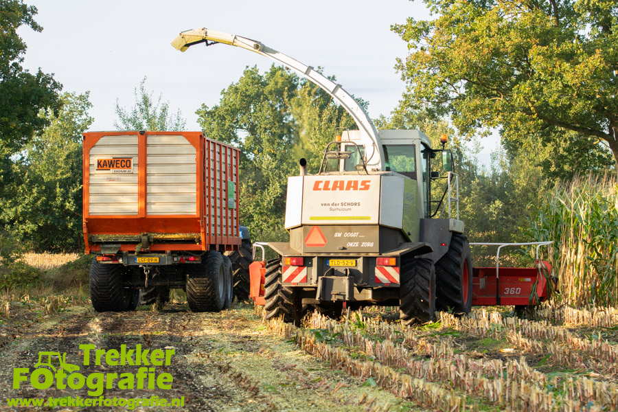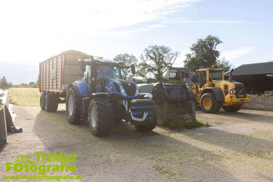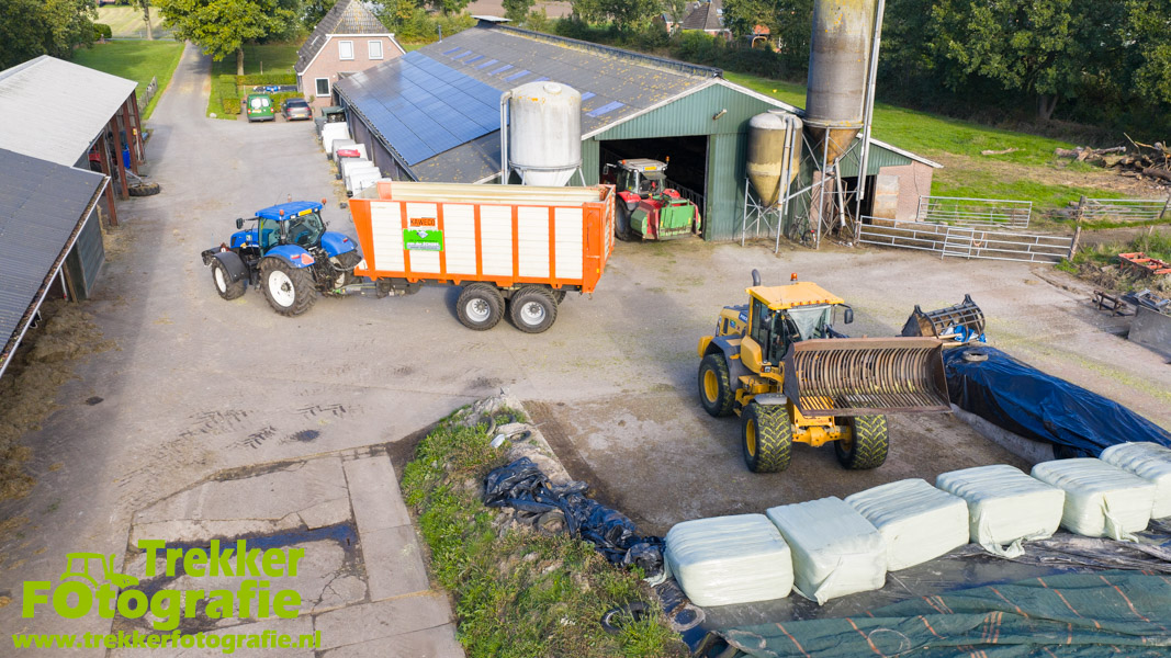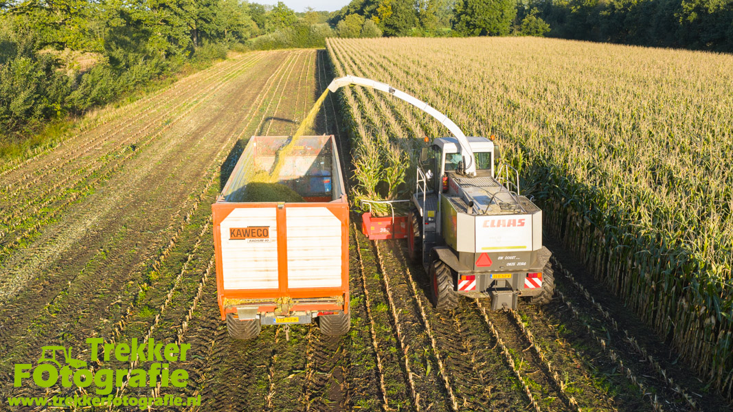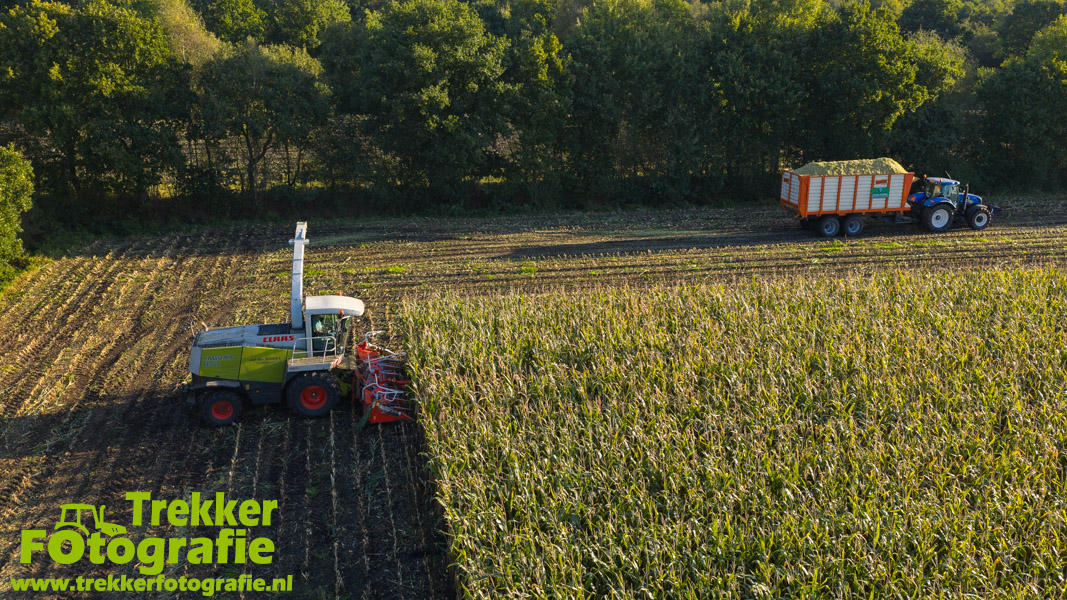 Twee weken geleden namen wij een kijkje bij het maïs hakselen door loonbedrijf van der Schors. Ze waren aan het maïs hakselen met hun Claas Jaguar 870 hakselaar met een Kemper 360 voorzetstuk. Onder de pijp reden hun New Holland T7.230 met een Kaweco Radium 40 en hun New Holland T7030 met eveneens een Kaweco Radium 40.