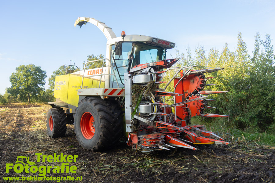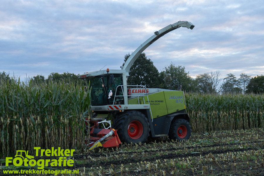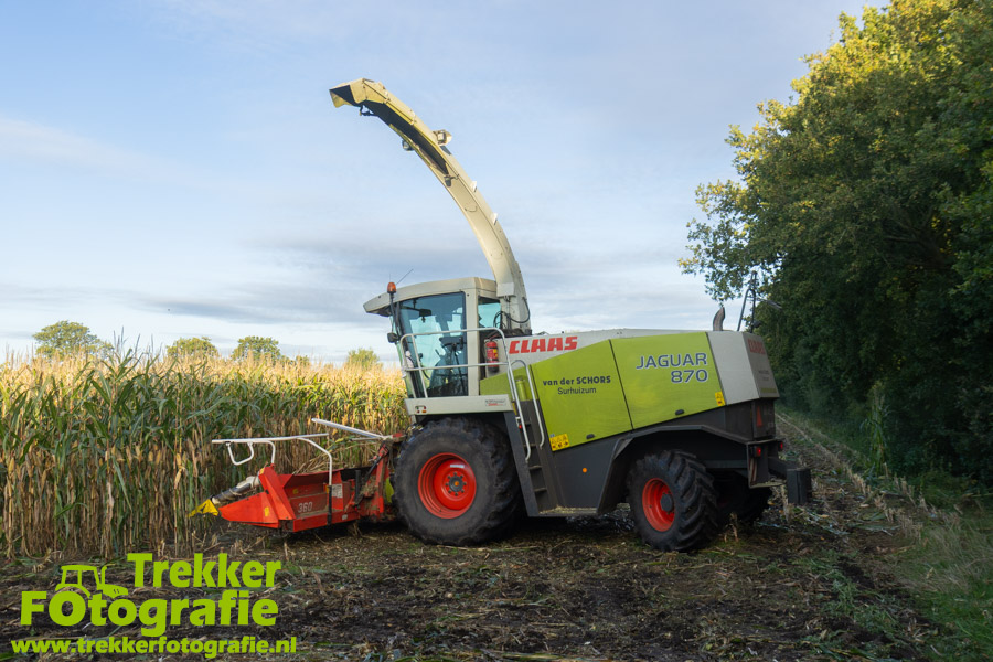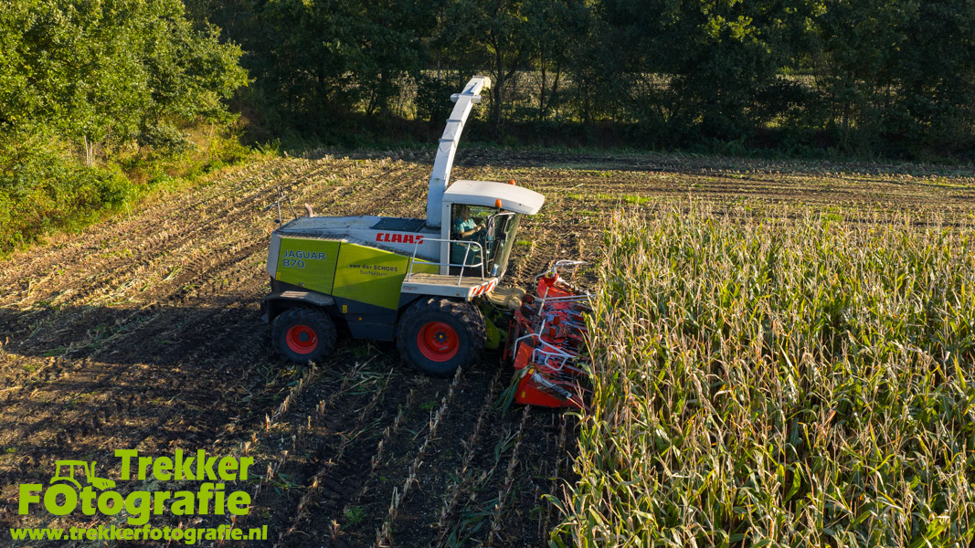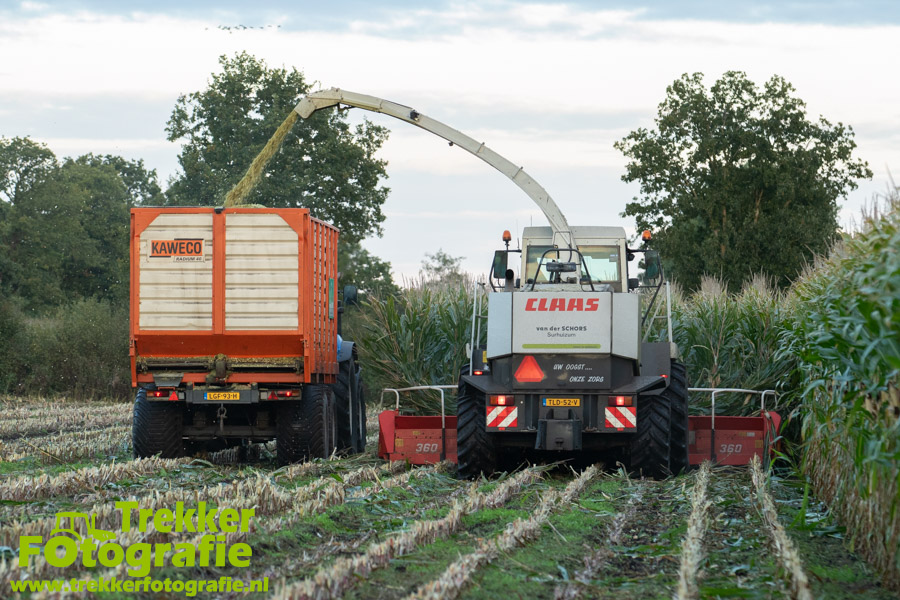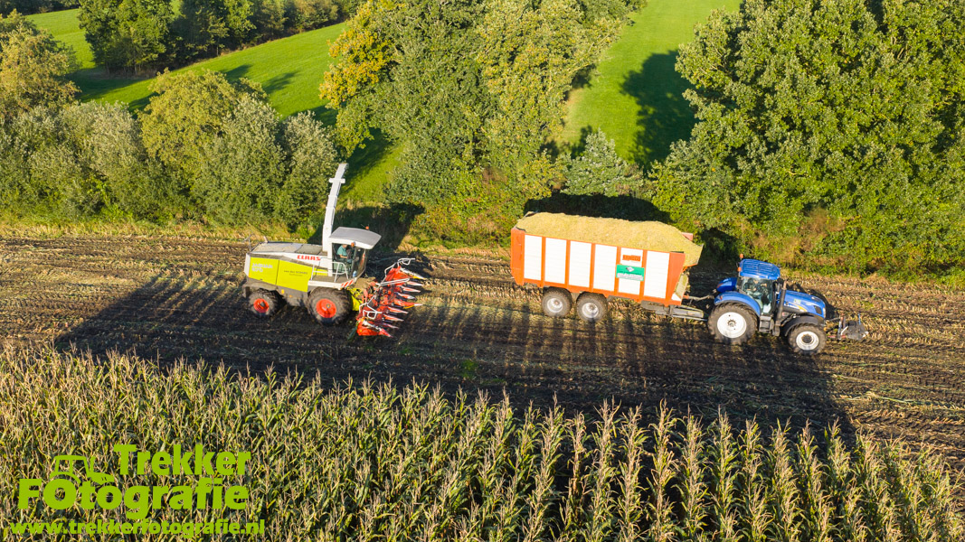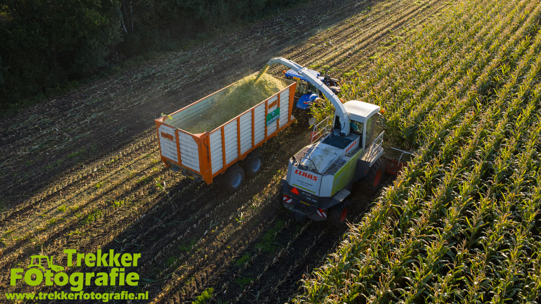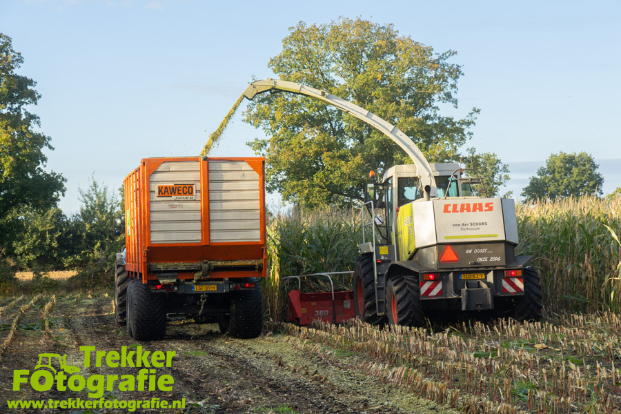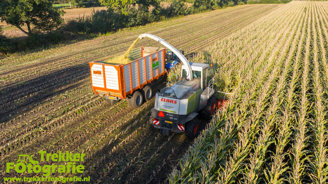 Twee weken geleden namen wij een kijkje bij het maïs hakselen door loonbedrijf van der Schors. Ze waren aan het maïs hakselen met hun Claas Jaguar 870 hakselaar met een Kemper 360 voorzetstuk. Onder de pijp reden hun New Holland T7.230 met een Kaweco Radium 40 en hun New Holland T7030 met eveneens een Kaweco Radium 40.