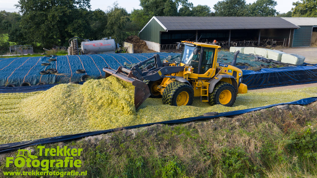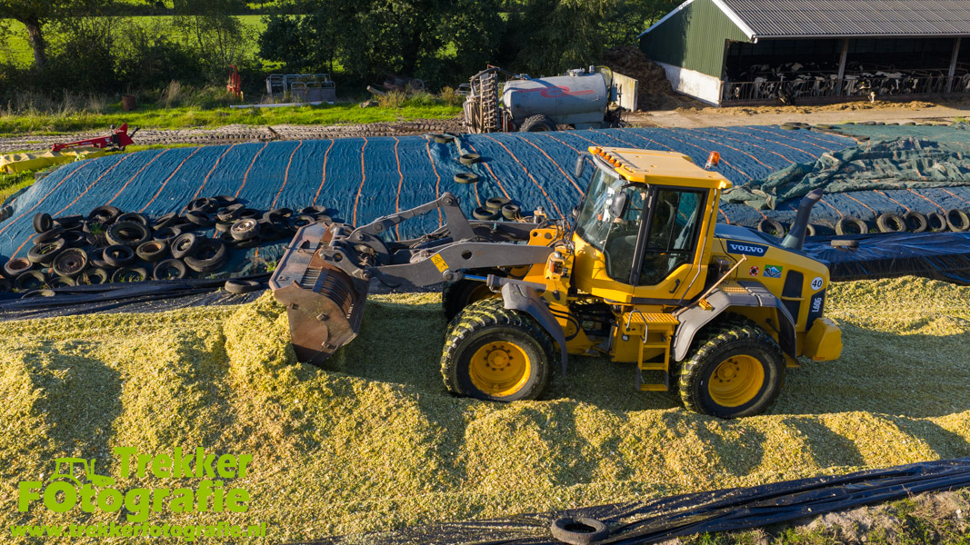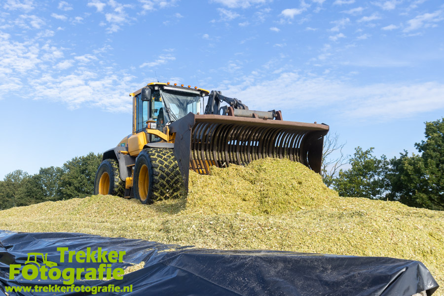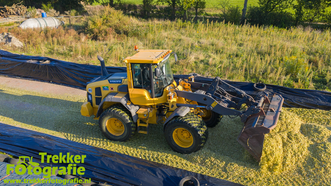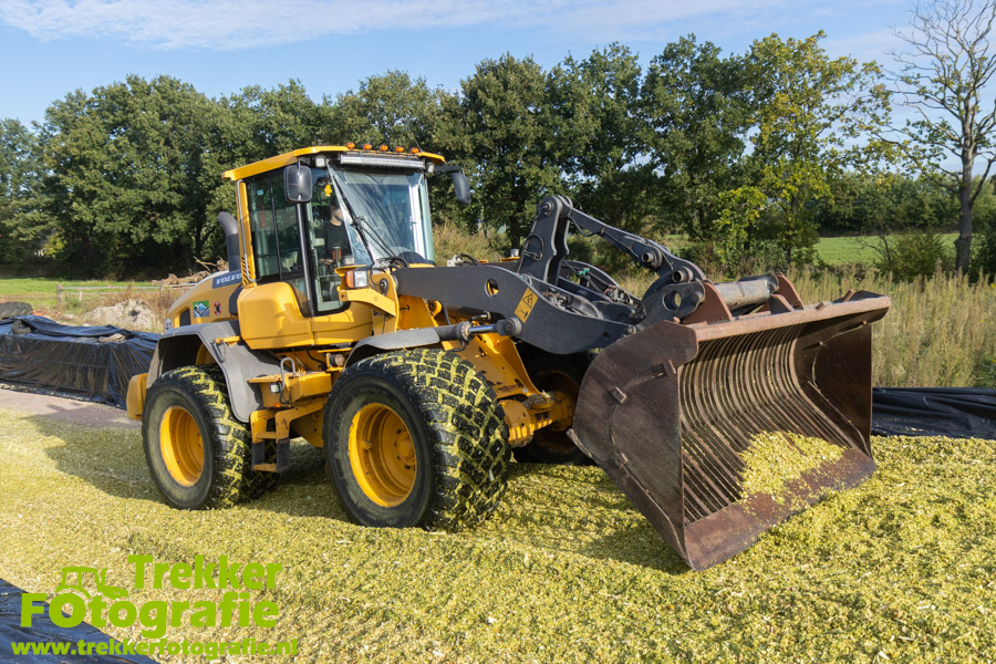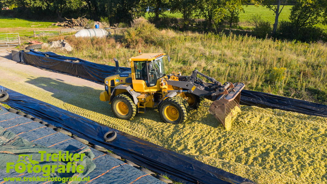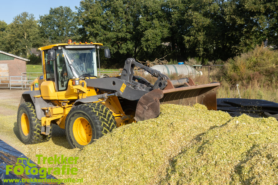 De maïs werd bij de boerderij in een sleufsilo verdeeld en aangereden met hun Volvo L60G shovel.