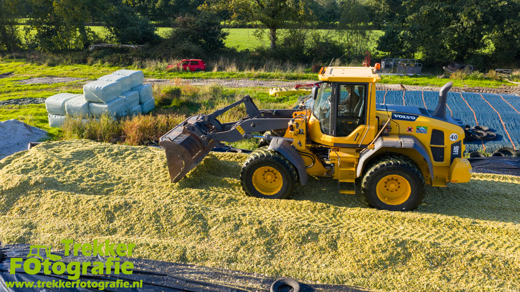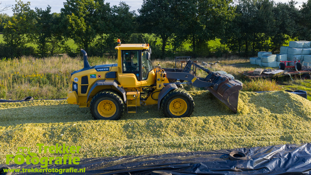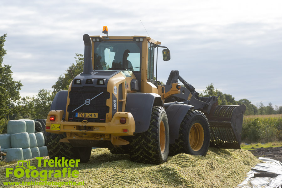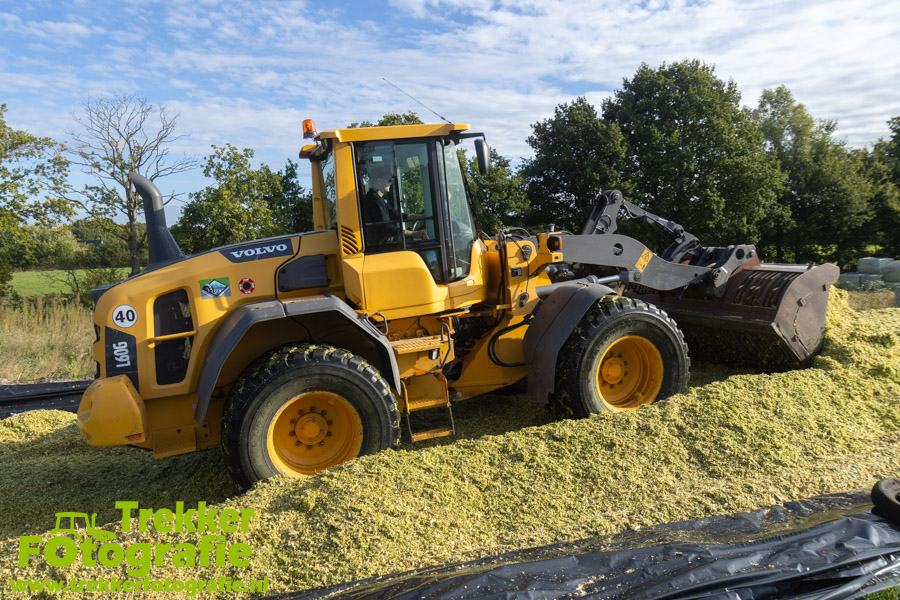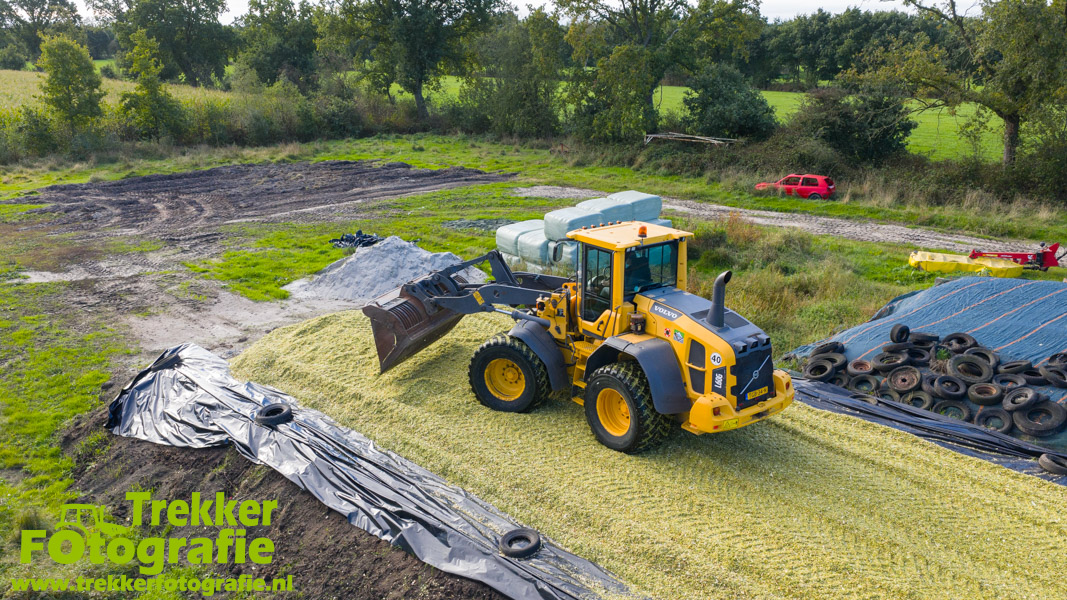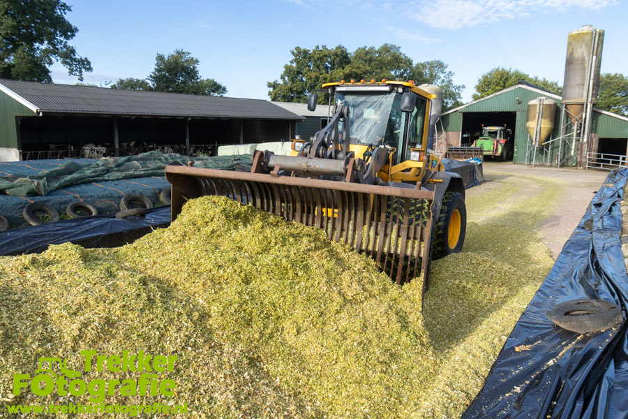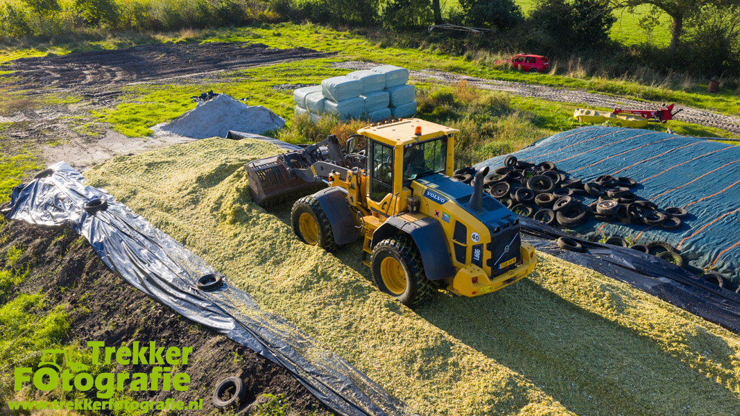 De maïs werd bij de boerderij in een sleufsilo verdeeld en aangereden met hun Volvo L60G shovel.