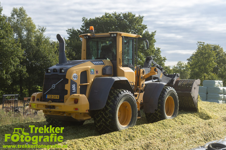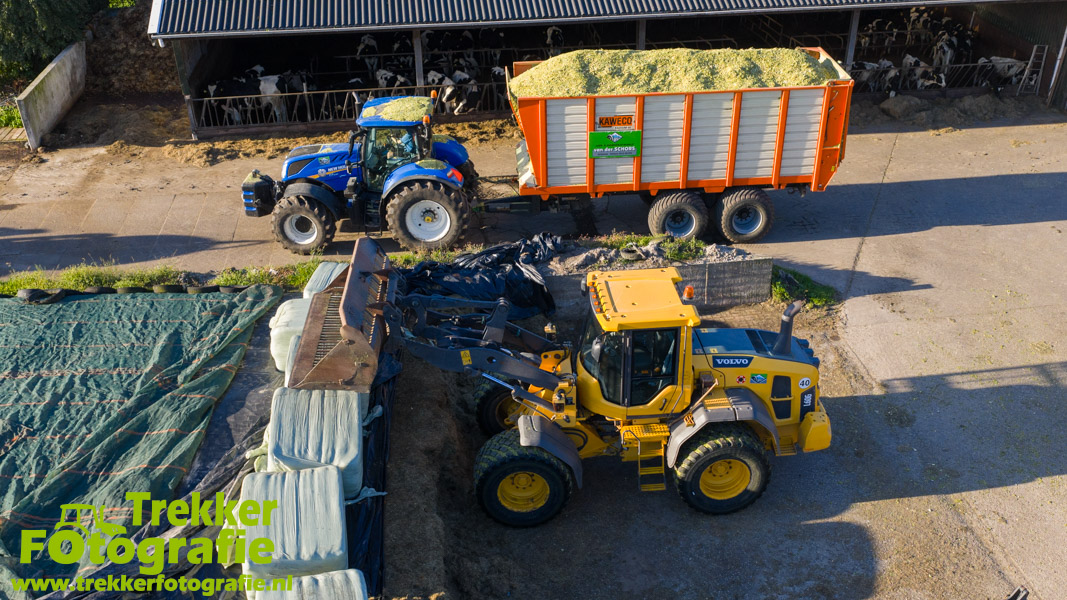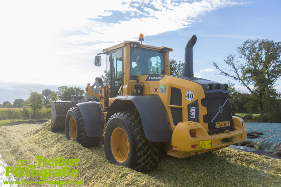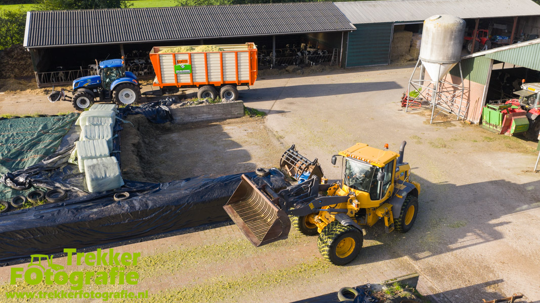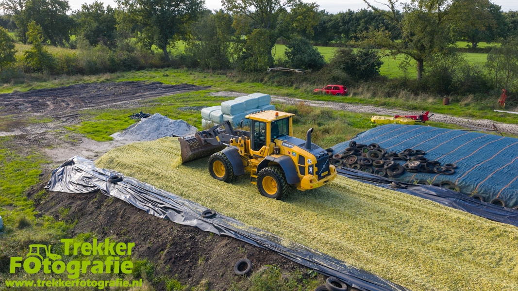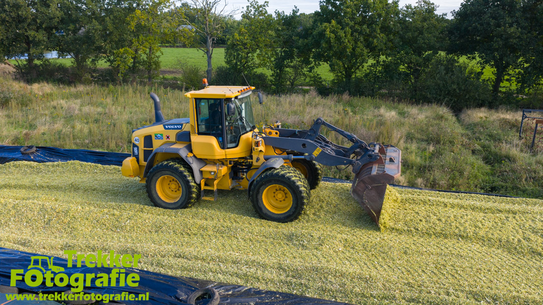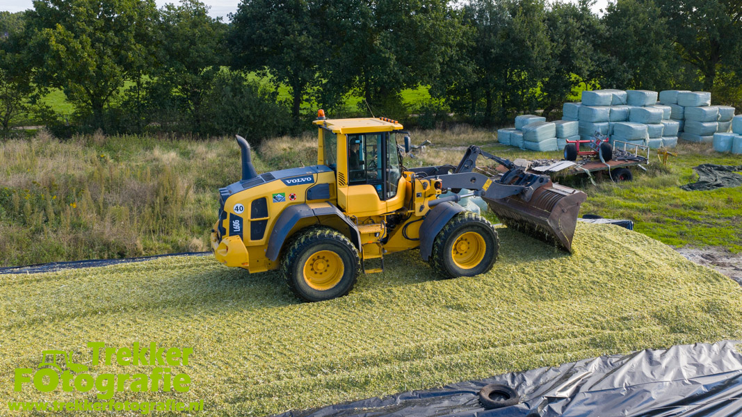 De maïs werd bij de boerderij in een sleufsilo verdeeld en aangereden met hun Volvo L60G shovel.