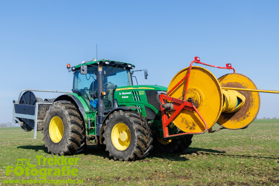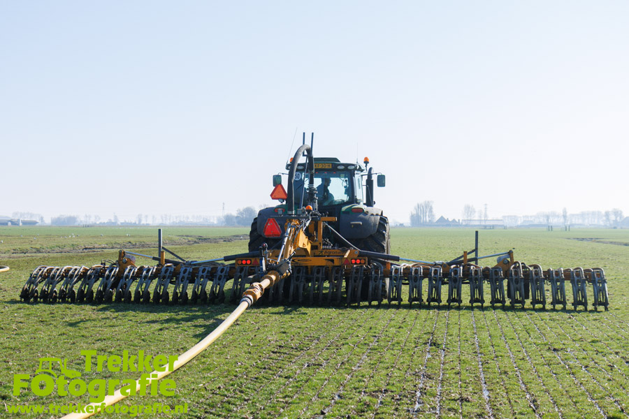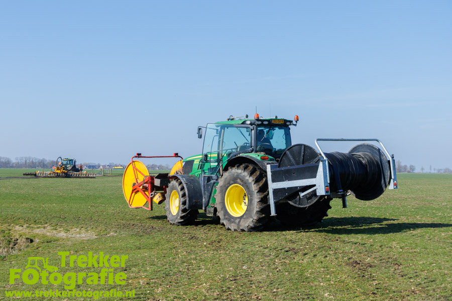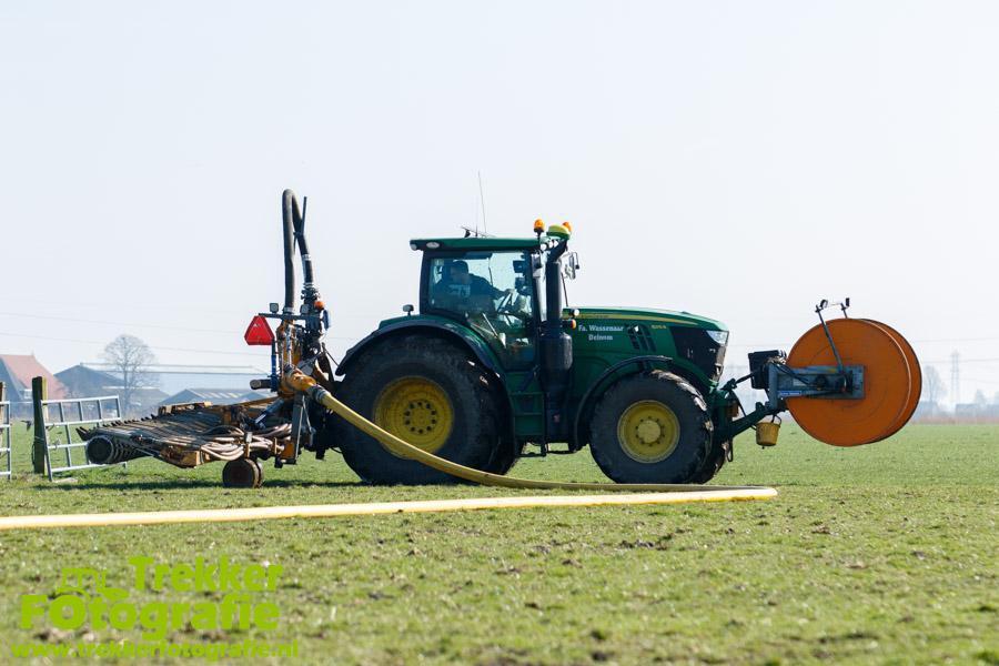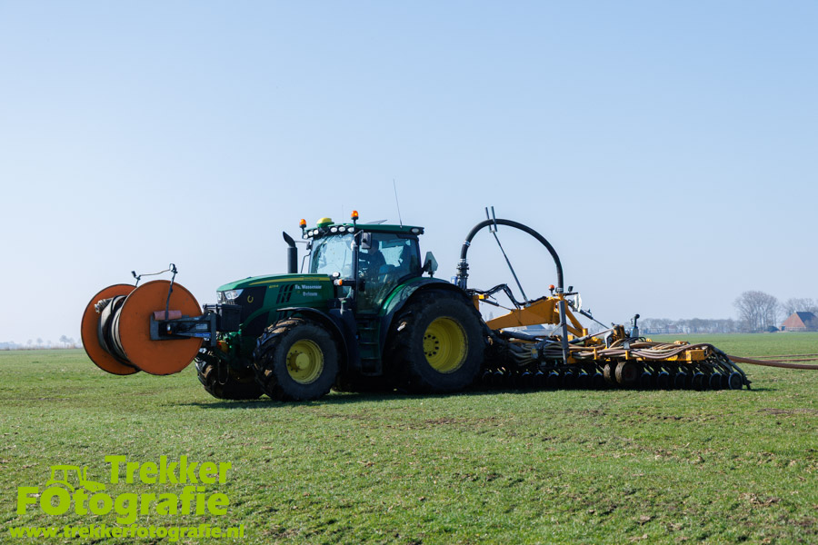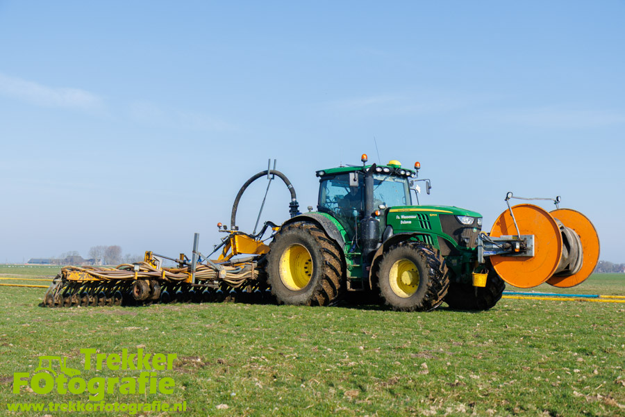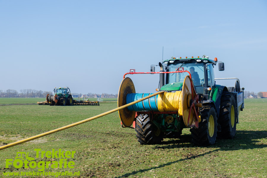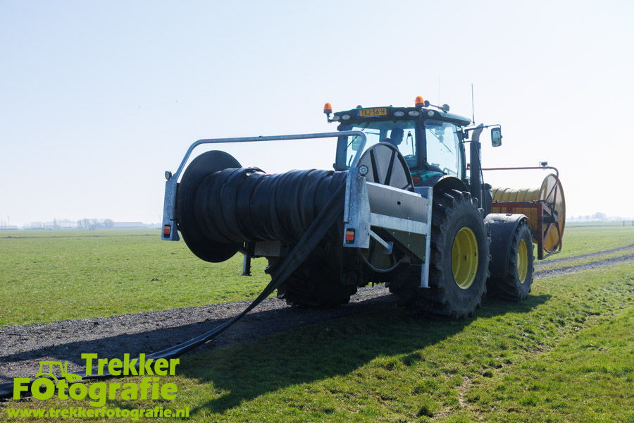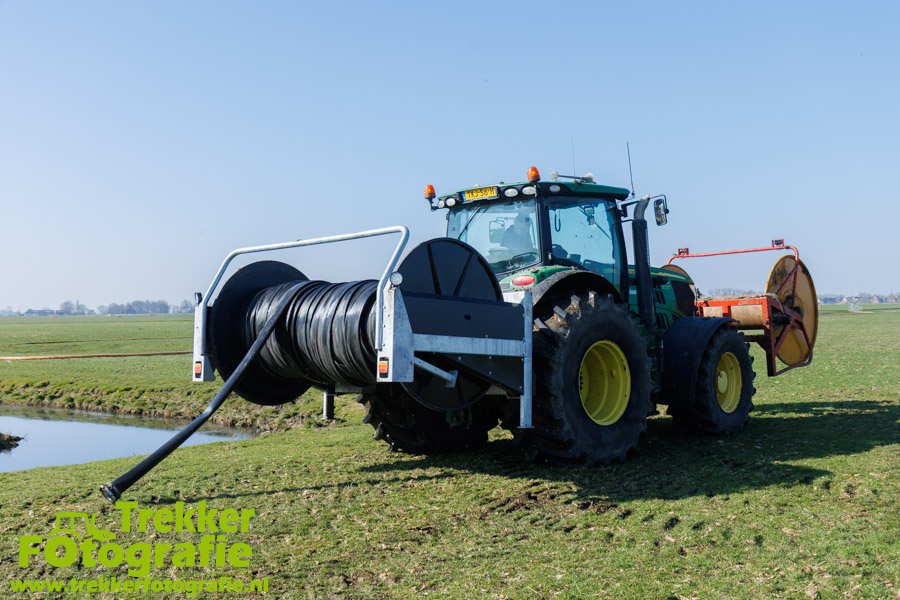 Dit jaar namen wij ook weer eens een kijkje bij het sleepslang bemesten door loonbedrijf Fa Wassenaar uit Deinum, dit werd gedaan met hun John Deere 6215R met een Agrometer Tjalma sleepslangbemester en een Systeembaars slanghaspel. Het op- en afrollen van de slangen werd gedaan met hun John Deere 6190R met achterop een nieuwe Buffalo slanghaspel en voorop een Schouten slanghaspel.
