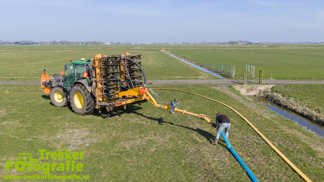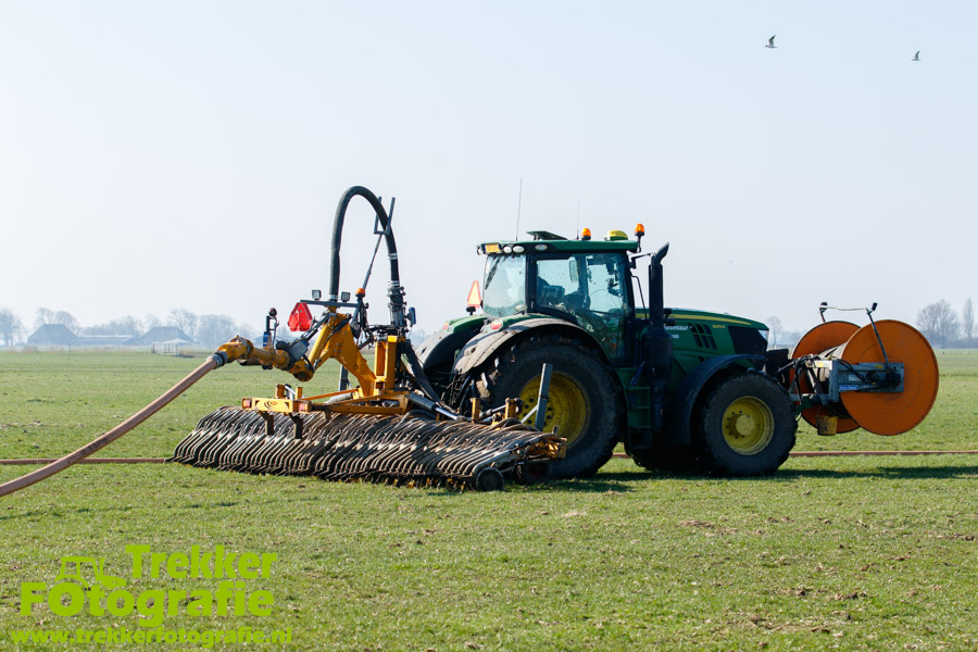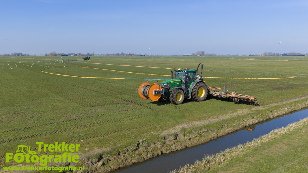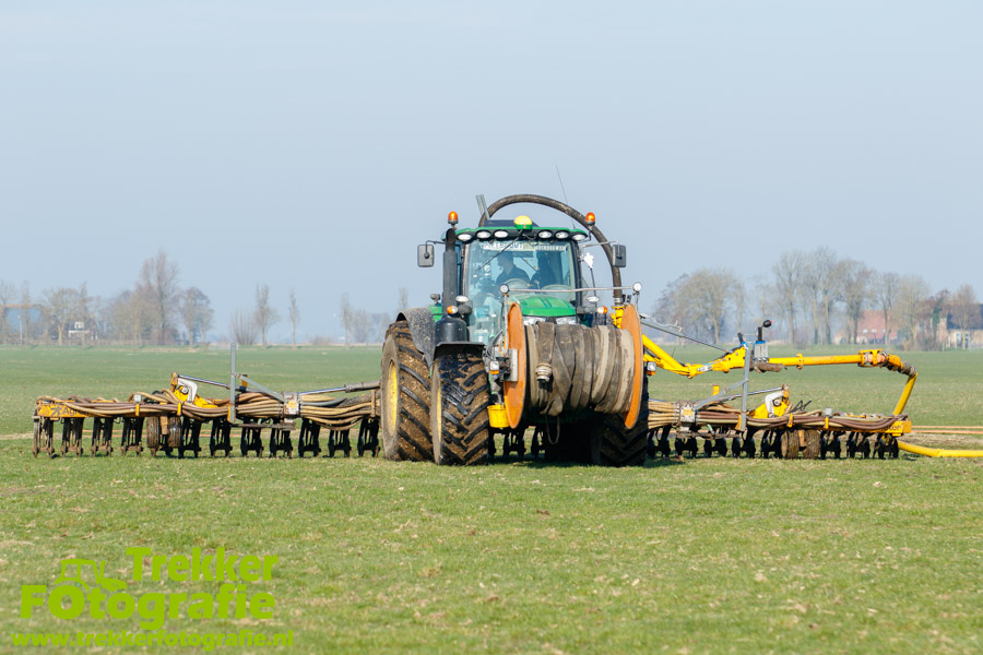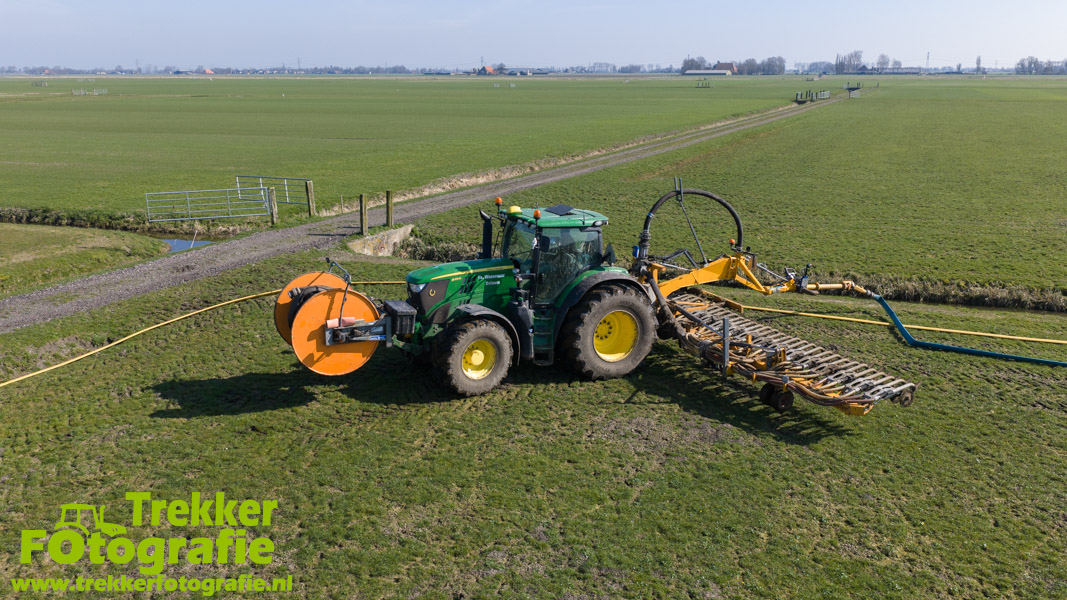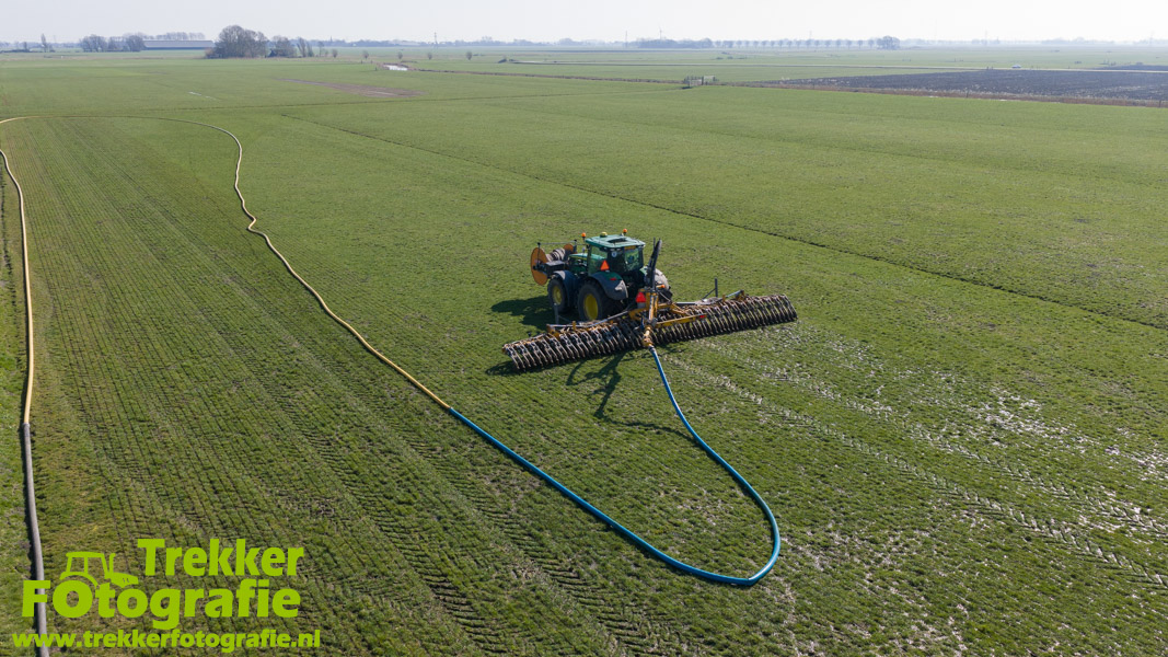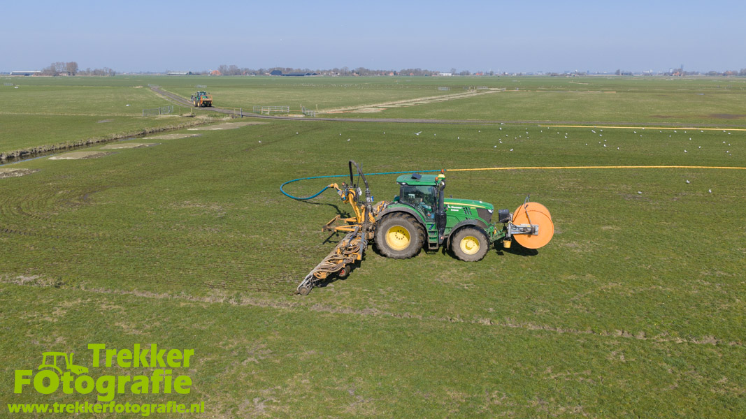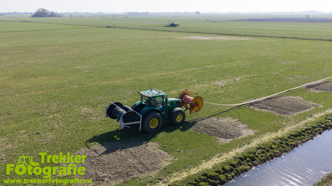 Dit jaar namen wij ook weer eens een kijkje bij het sleepslang bemesten door loonbedrijf Fa Wassenaar uit Deinum, dit werd gedaan met hun John Deere 6215R met een Agrometer Tjalma sleepslangbemester en een Systeembaars slanghaspel. Het op- en afrollen van de slangen werd gedaan met hun John Deere 6190R met achterop een nieuwe Buffalo slanghaspel en voorop een Schouten slanghaspel.