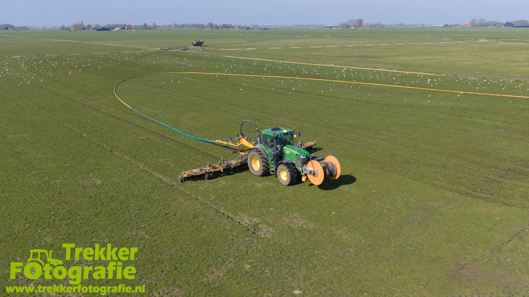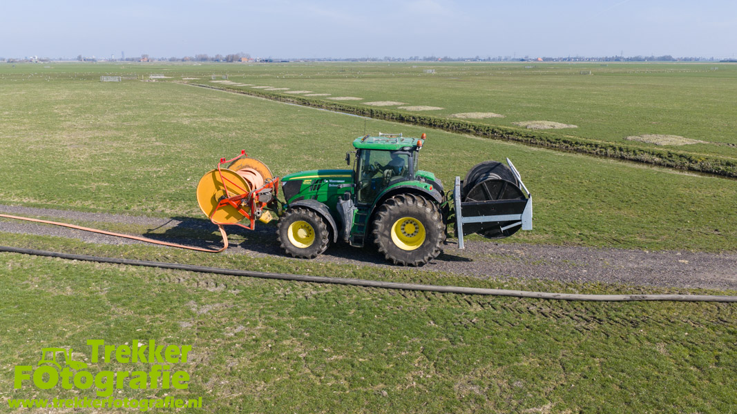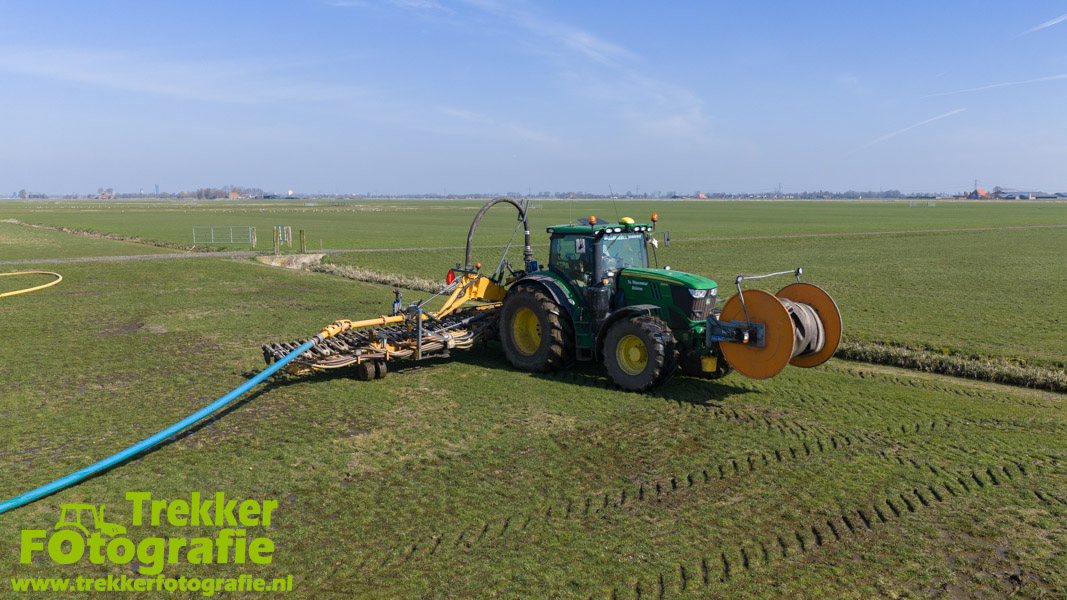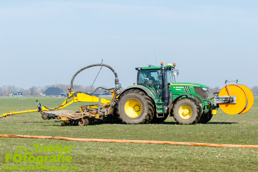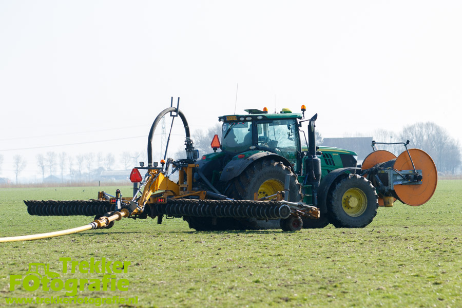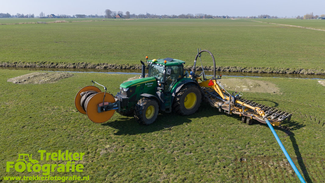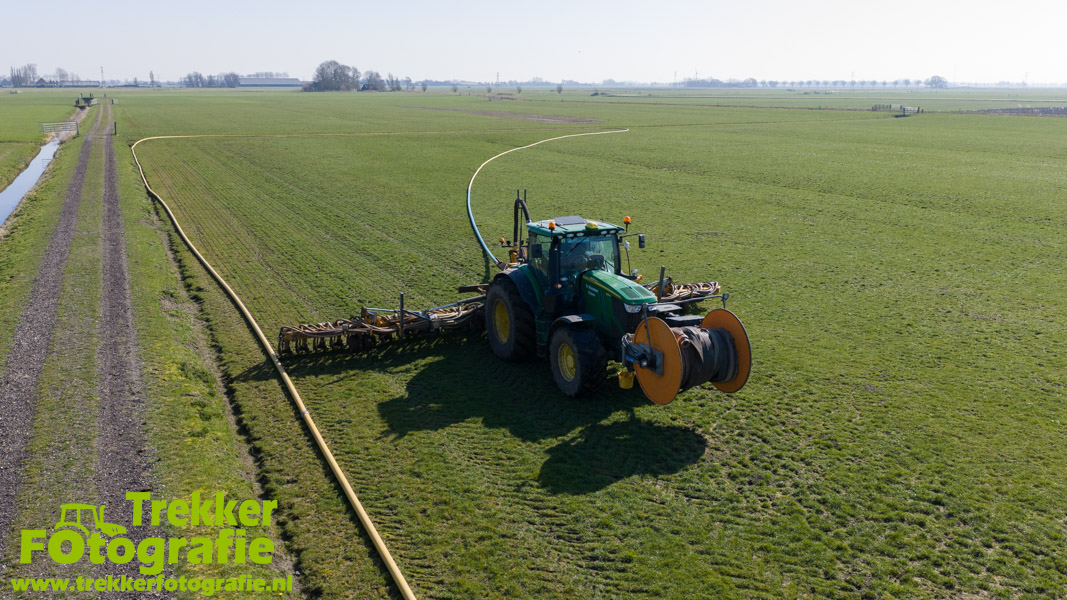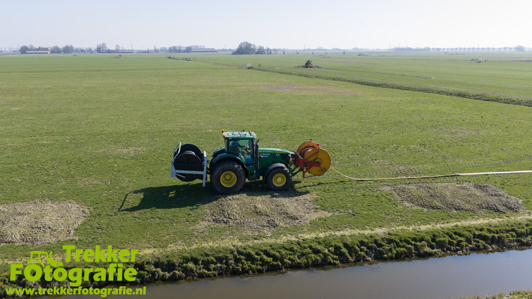 Dit jaar namen wij ook weer eens een kijkje bij het sleepslang bemesten door loonbedrijf Fa Wassenaar uit Deinum, dit werd gedaan met hun John Deere 6215R met een Agrometer Tjalma sleepslangbemester en een Systeembaars slanghaspel. Het op- en afrollen van de slangen werd gedaan met hun John Deere 6190R met achterop een nieuwe Buffalo slanghaspel en voorop een Schouten slanghaspel.