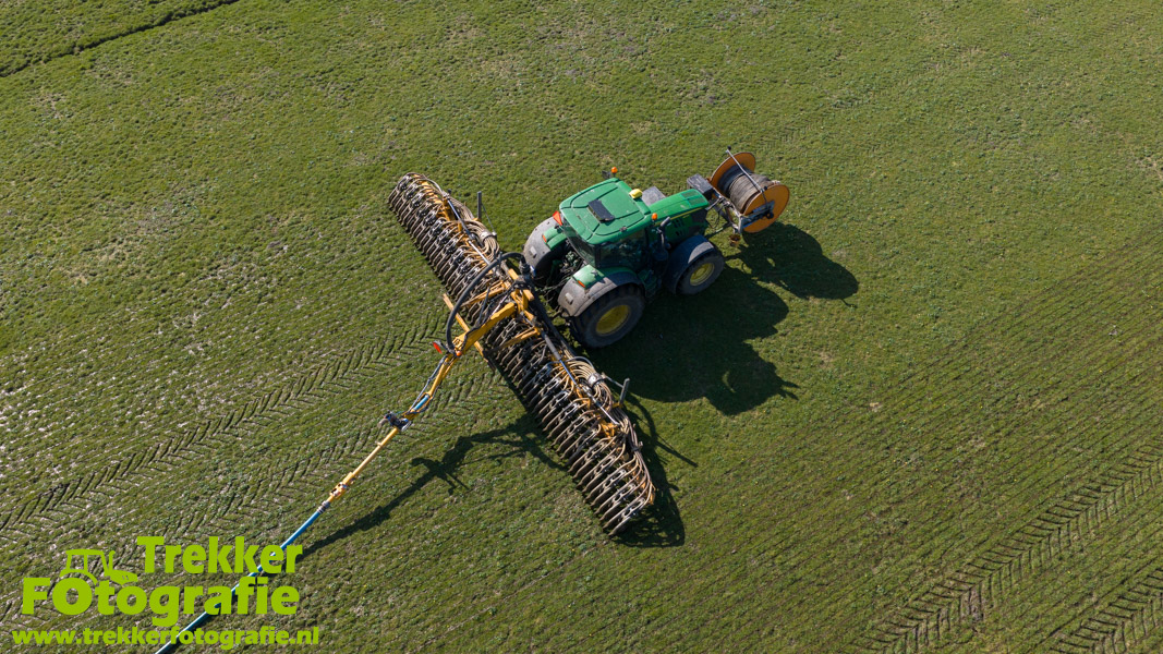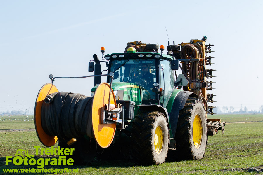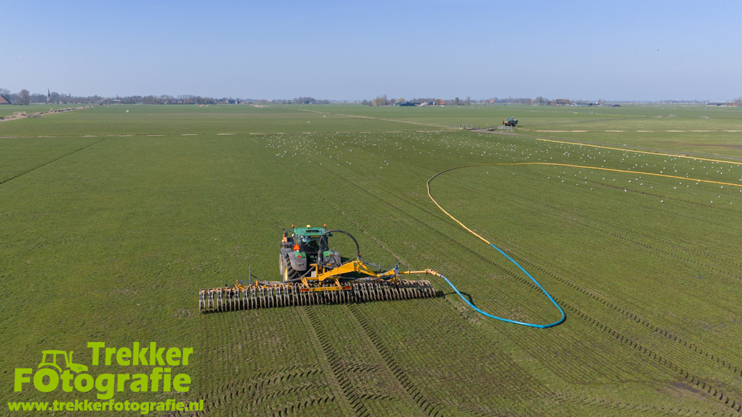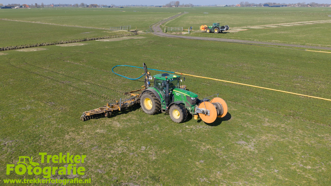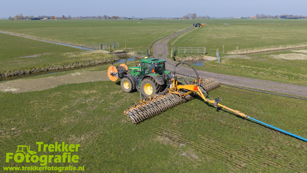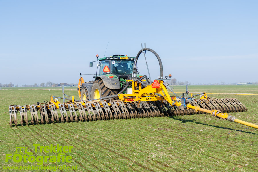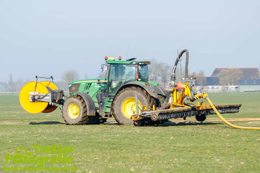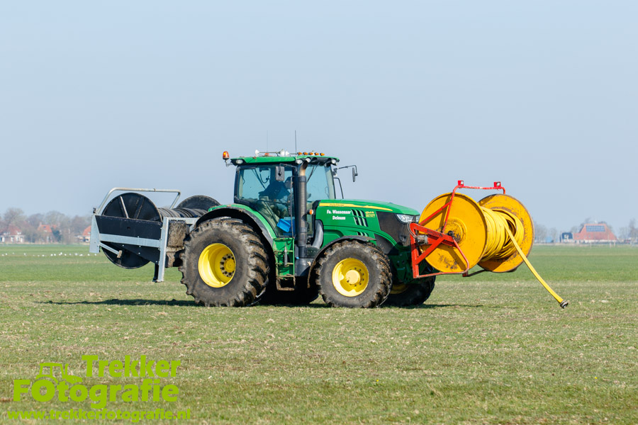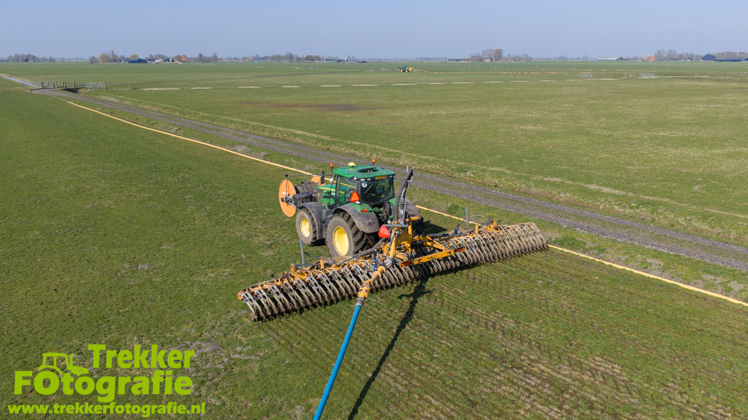 Dit jaar namen wij ook weer eens een kijkje bij het sleepslang bemesten door loonbedrijf Fa Wassenaar uit Deinum, dit werd gedaan met hun John Deere 6215R met een Agrometer Tjalma sleepslangbemester en een Systeembaars slanghaspel. Het op- en afrollen van de slangen werd gedaan met hun John Deere 6190R met achterop een nieuwe Buffalo slanghaspel en voorop een Schouten slanghaspel.