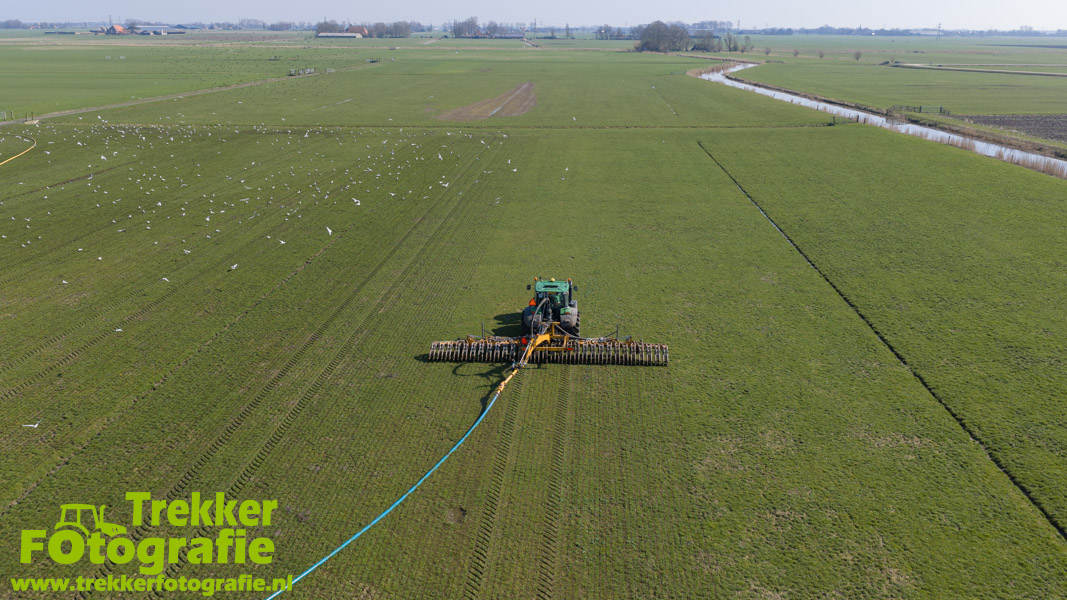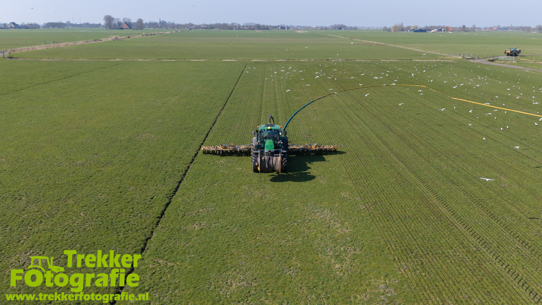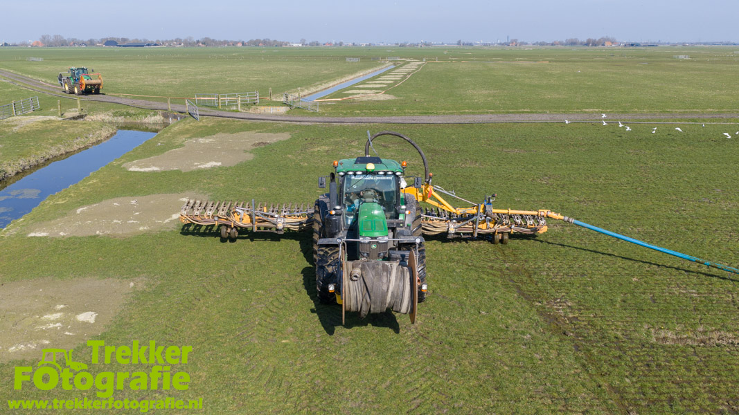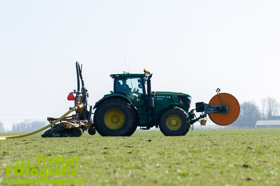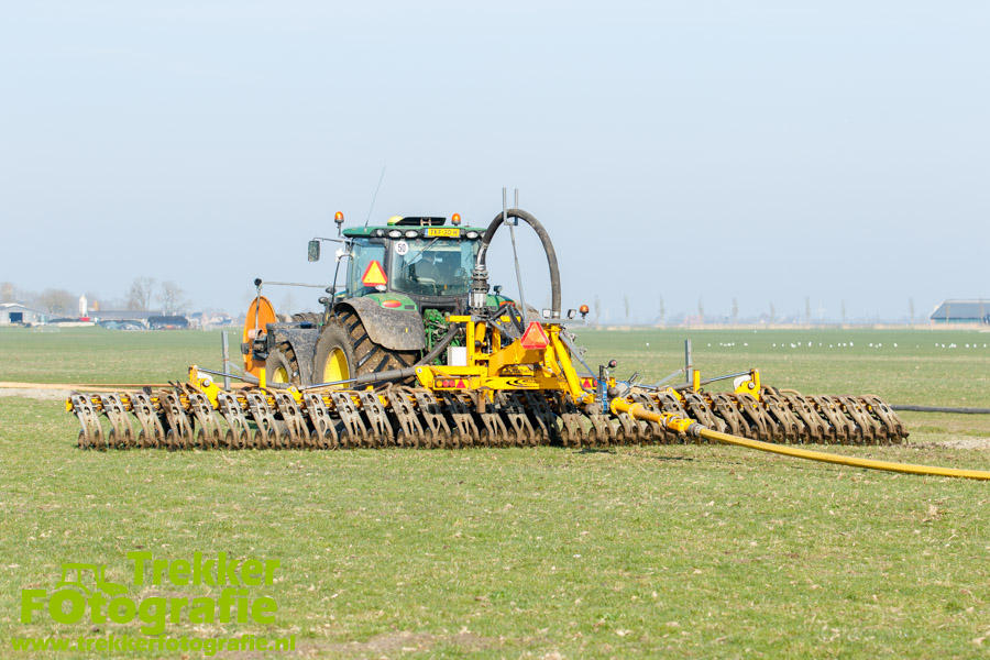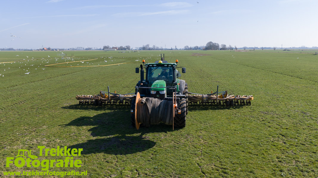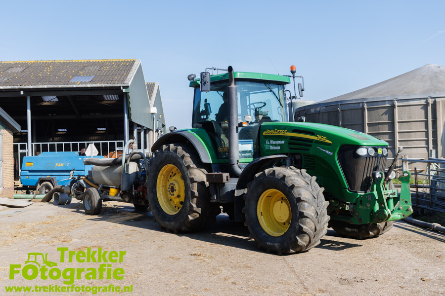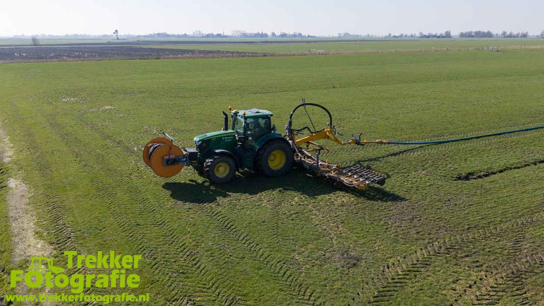 Dit jaar namen wij ook weer eens een kijkje bij het sleepslang bemesten door loonbedrijf Fa Wassenaar uit Deinum, dit werd gedaan met hun John Deere 6215R met een Agrometer Tjalma sleepslangbemester en een Systeembaars slanghaspel. Het op- en afrollen van de slangen werd gedaan met hun John Deere 6190R met achterop een nieuwe Buffalo slanghaspel en voorop een Schouten slanghaspel.