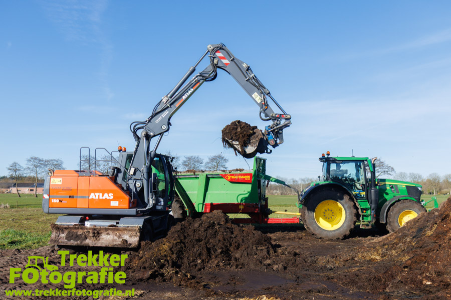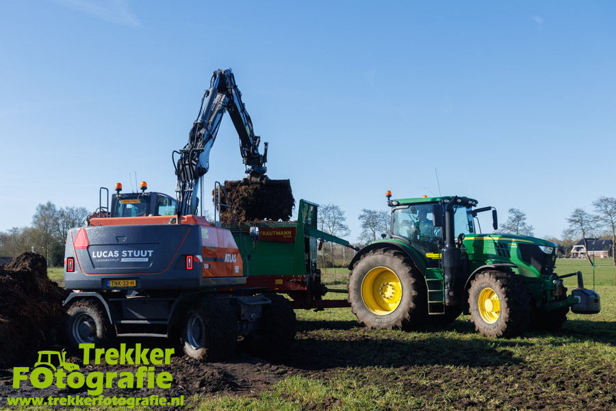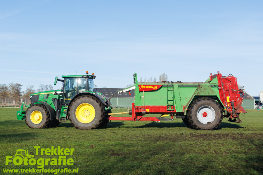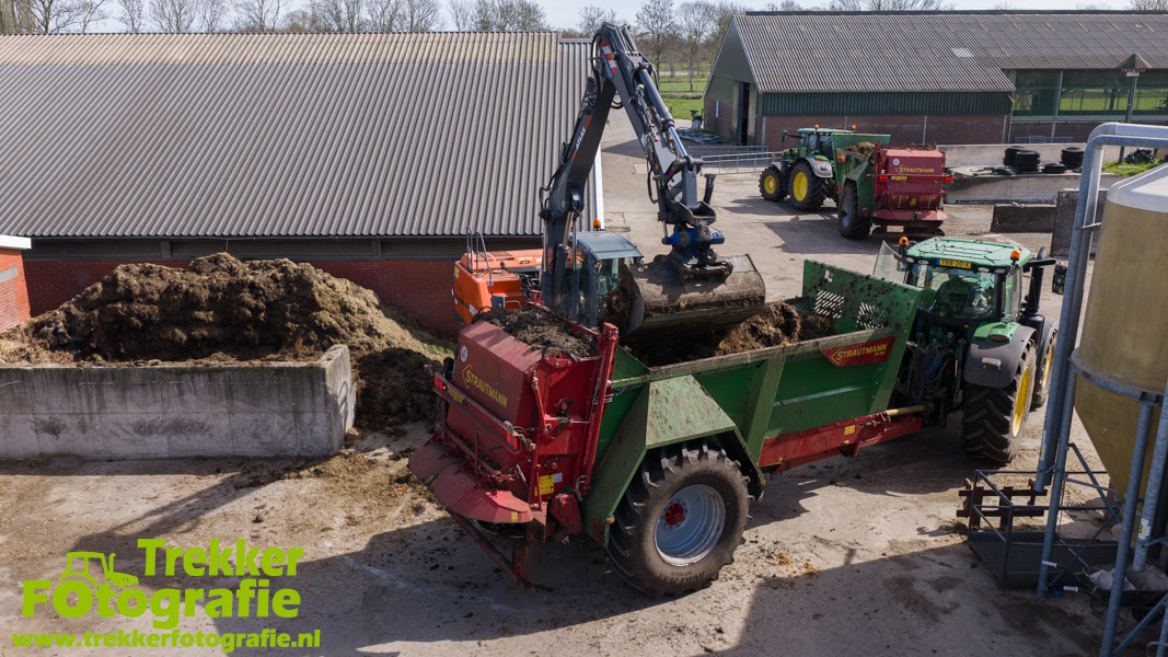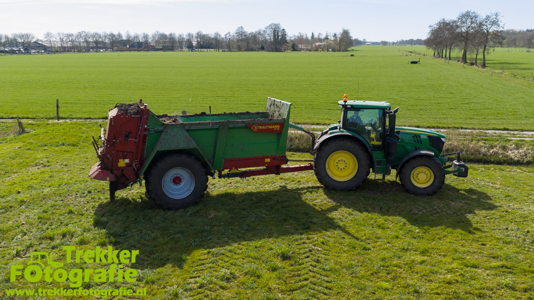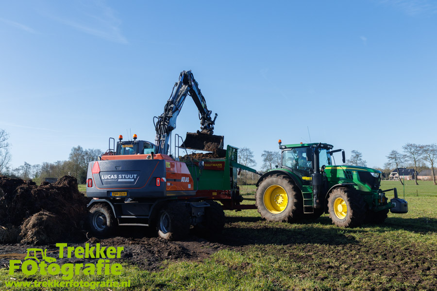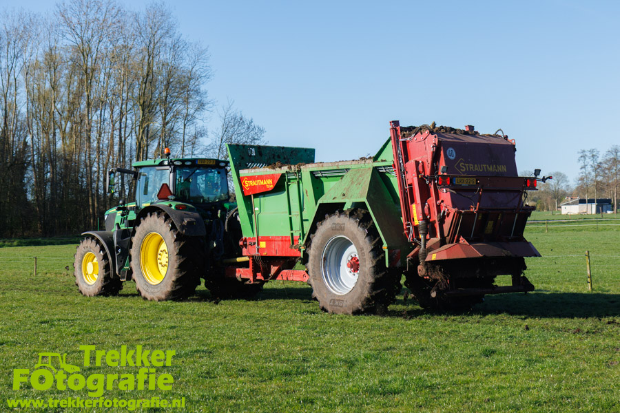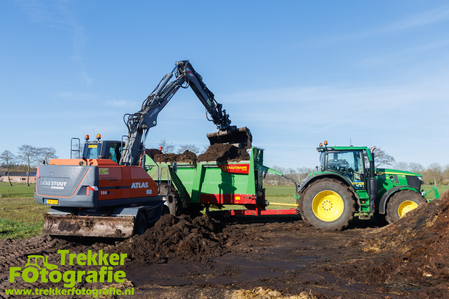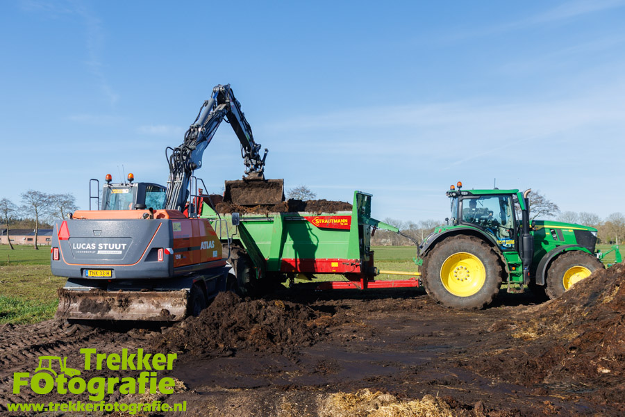 Sinds dit jaar word het vaste mest strooien bij loonbedrijf Lucas Stuut gedaan met hun twee nieuwe Strautmann TS 140 meststrooiers. Tijdens ons bezoek werd de vaste mest gestrooid op toekomstig bouwland en stonden hun John Deere 6R 215 en John Deere 6175R voor de nieuwe strooiers. Het volladen van de strooiers werd gedaan met hun Atlas 150W Blue mobiele kraan.