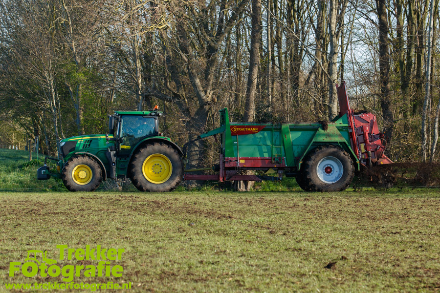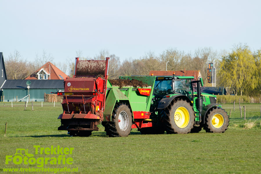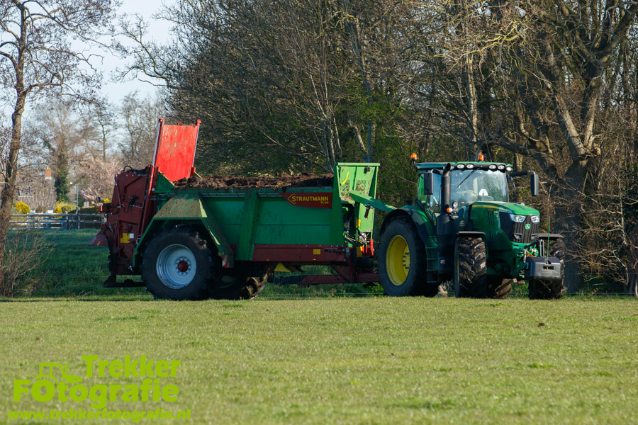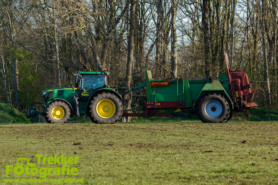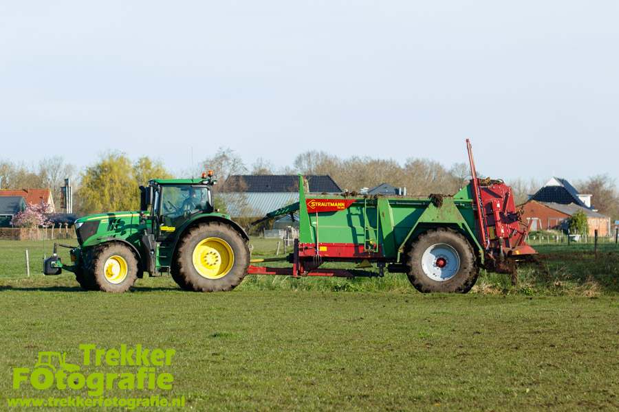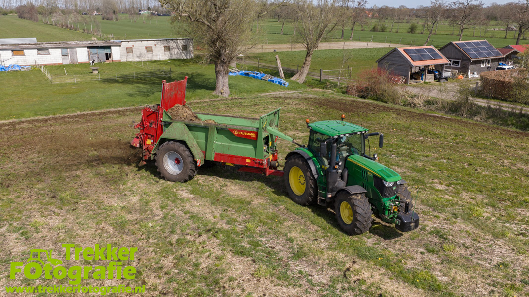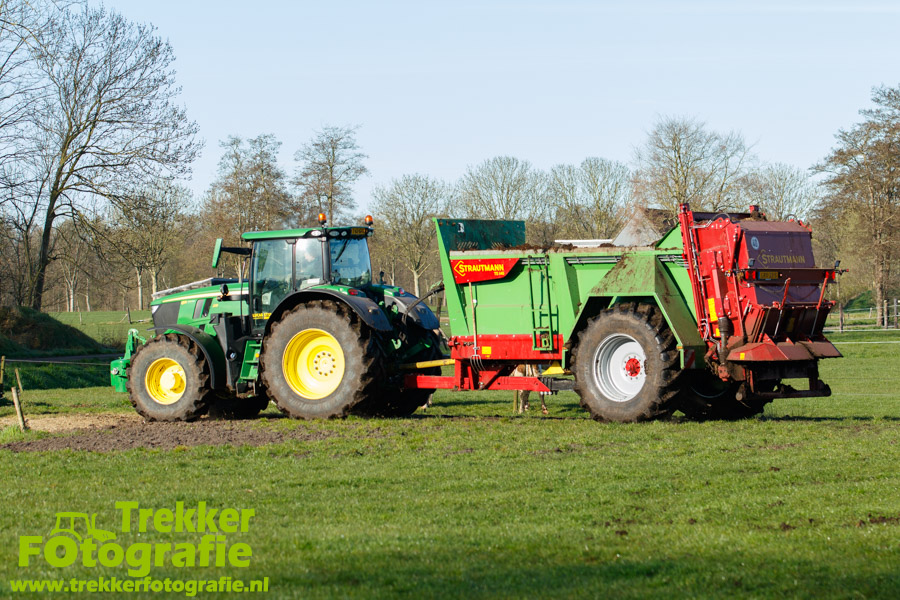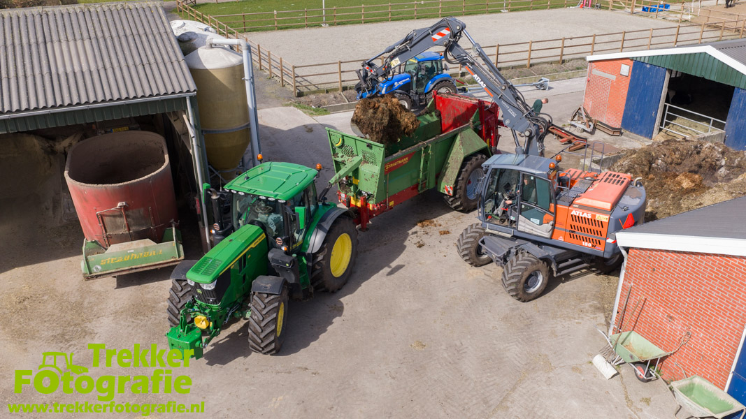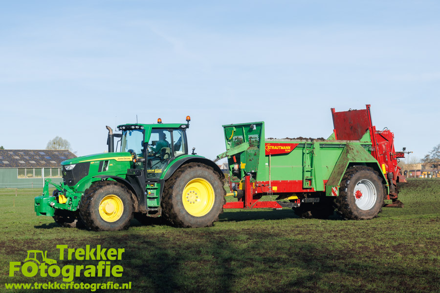 Sinds dit jaar word het vaste mest strooien bij loonbedrijf Lucas Stuut gedaan met hun twee nieuwe Strautmann TS 140 meststrooiers. Tijdens ons bezoek werd de vaste mest gestrooid op toekomstig bouwland en stonden hun John Deere 6R 215 en John Deere 6175R voor de nieuwe strooiers. Het volladen van de strooiers werd gedaan met hun Atlas 150W Blue mobiele kraan.